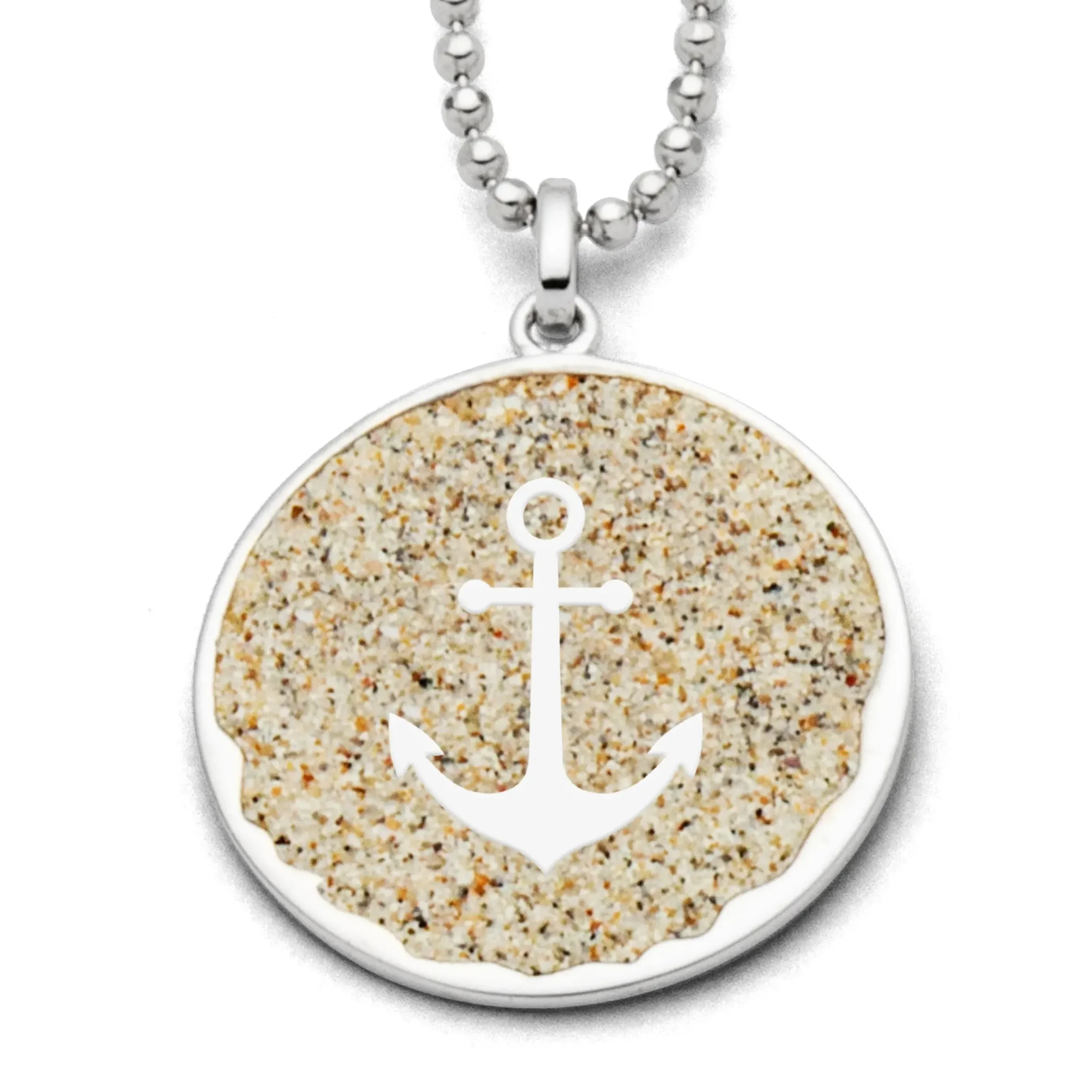 Maritimer, runder Anhänger „Anker 2.0“ mit einem Anker und einem Wellenmuster am unteren Rand, eingebettet in Strandsand. Aus poliertem und rhodiniertem 925er Sterling-Silber. Gut kombinierbar mit einer rhodinierten Schlangenkette oder einer rhodinierten Kugelkette. Durch die Rhodinierung ist das Schmuckstück anlaufgeschützt.