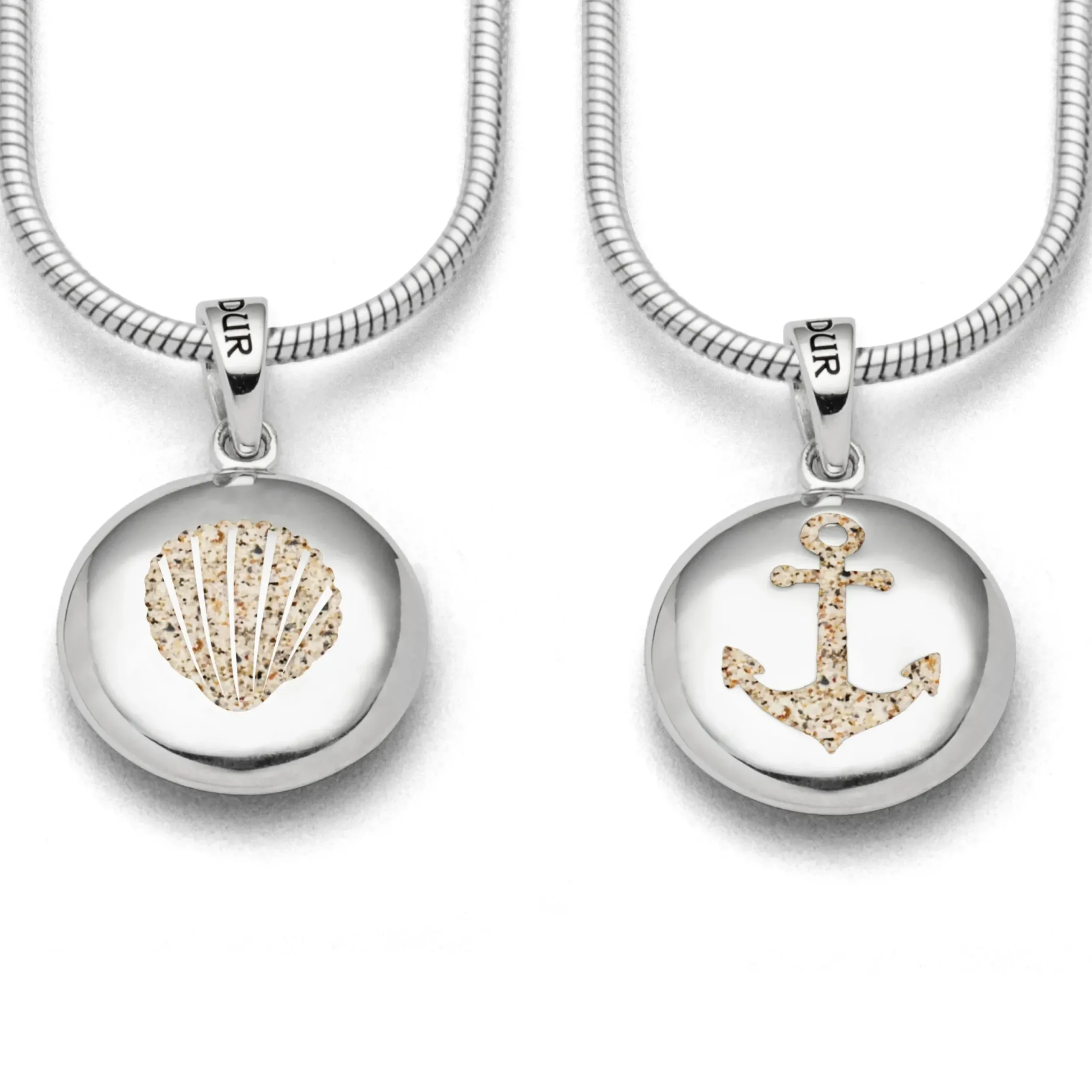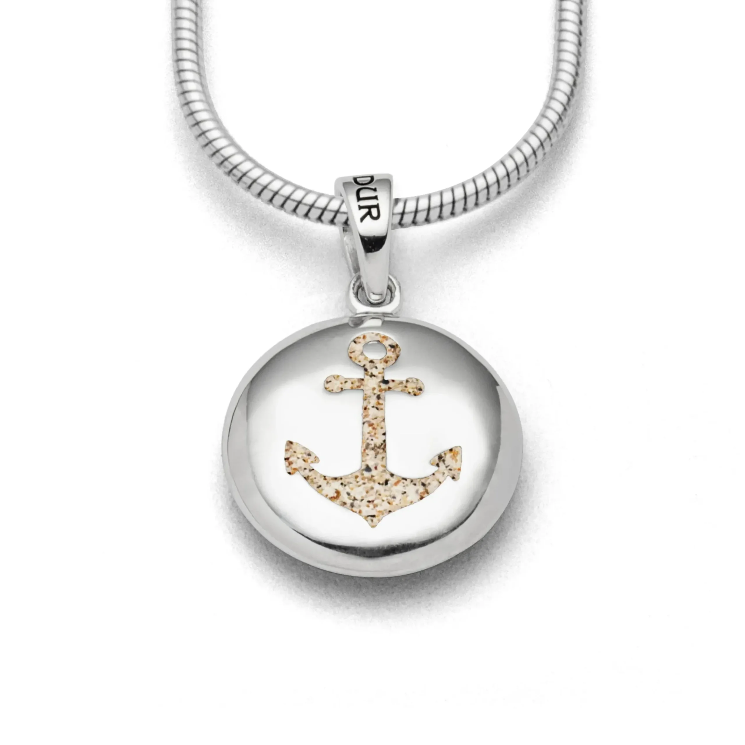 Ellipsenförmiger Anhänger mit den Motiven „Anker und Muschel“, gefüllt mit Strandsand und alles gefasst in poliertem, rhodiniertem 925er Sterling-Silber.