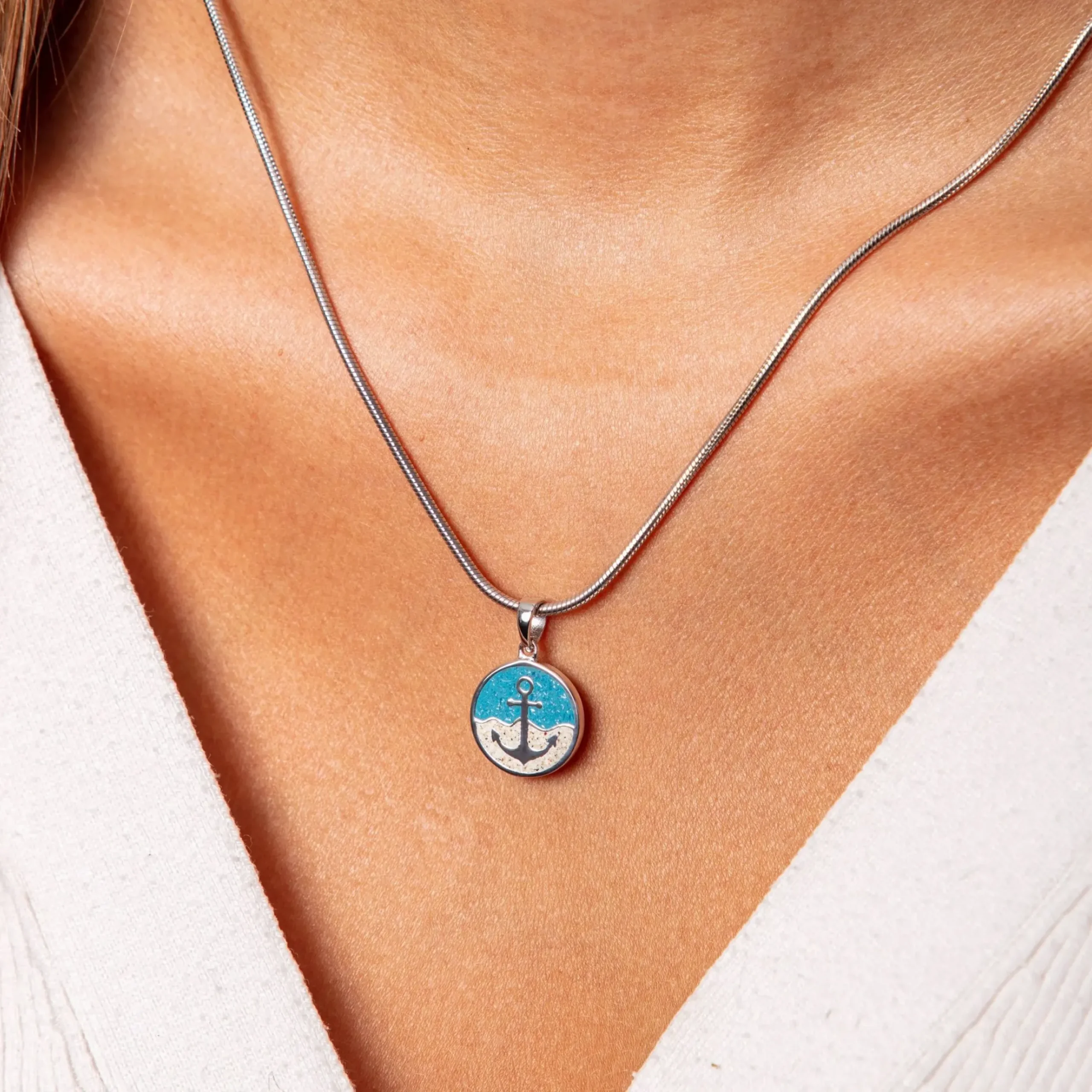 Ein einziger Blick und Sie sind im Urlaub. Denn Sie tragen ihn jetzt immer bei sich.Als Erinnerung an schöne Urlaubsmomente, aber auch für alle die Meer und Strand lieben, oder ein maritimes Statement setzen möchten, ist dieses schöne Schmuckstück unverzichtbar.Der außergewöhnliche Anhänger verzaubert mit klarem, glänzenden Design und besticht durch ein silbernes „Anker – Motiv“, eingebettet in feinsten Sand vom Strand, sowie gemahlenen Kyanitstein. Durch die edle Materialkombination von feinem Strandsand, blauem Steinsand und hochwertigem, rhodinierten 952er Sterling Silber (anlaufgeschützt), ist der Anhänger ein echter Blickfang, der jedes Outfit aufwertet. Gut kombinierbar ist er mit einer rhodinierten Schlangenkette.