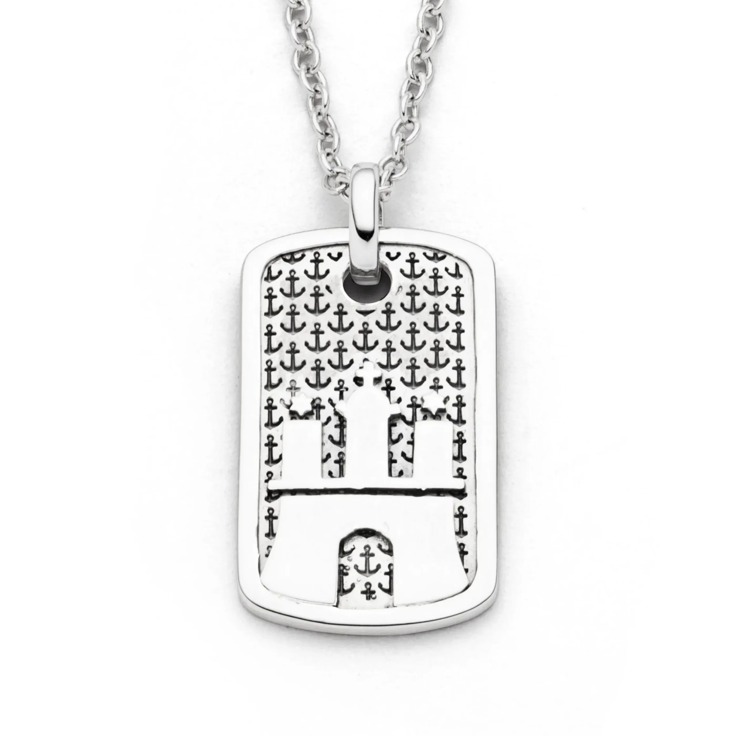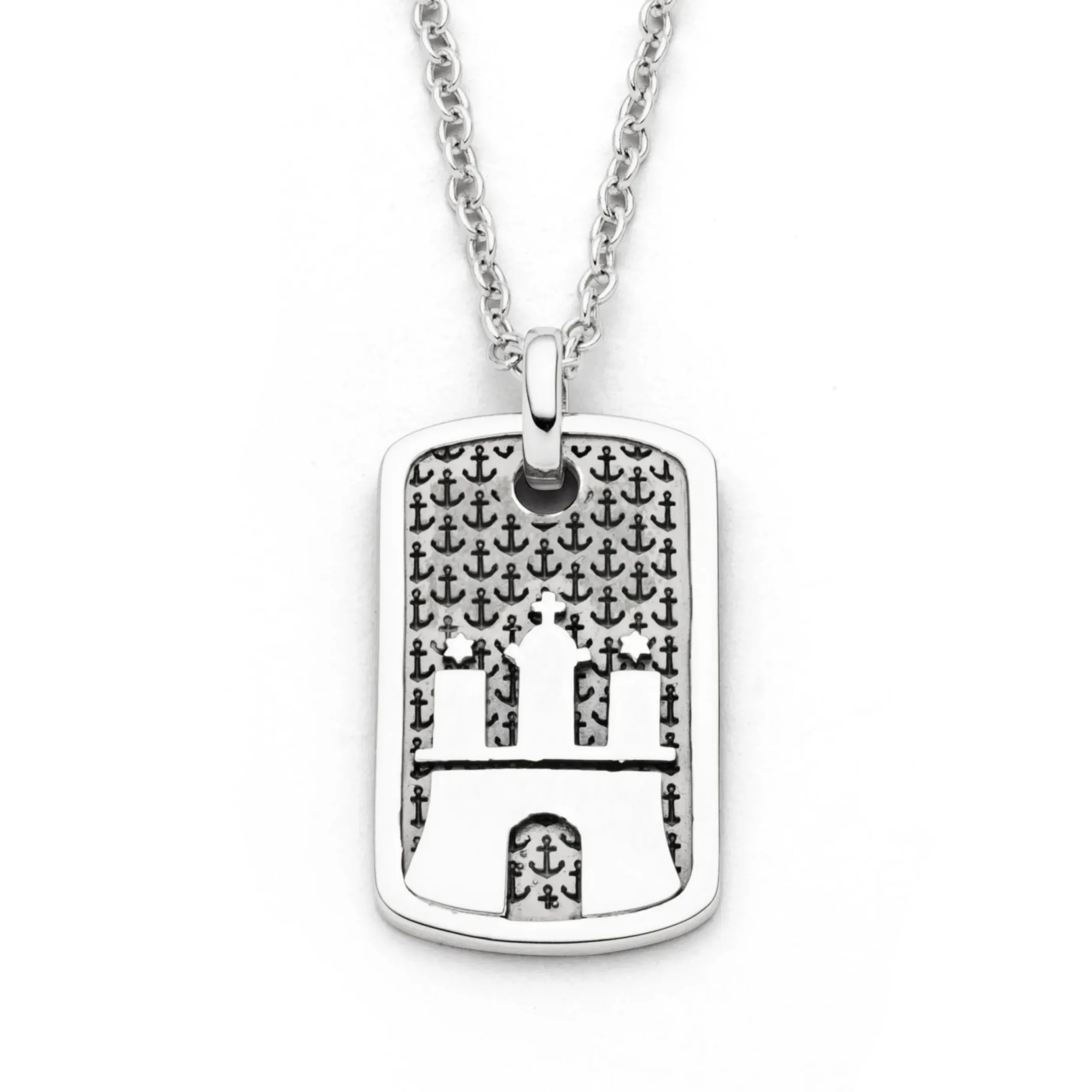 Flacher, rechteckiger Anhänger Ankerplatz „Hamburg“ mit dem silbernen Motiv: „Wappen Hamburg“ und gelaserten, Anker-Icons im Hintergrund, aus rhodiniertem 925er Sterling-Silber.