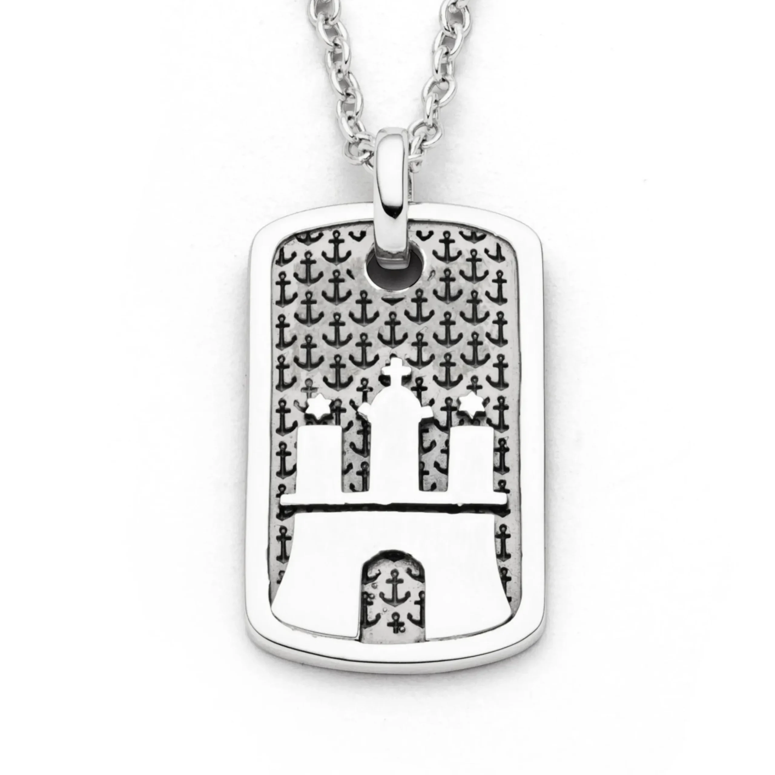 Flacher, rechteckiger Anhänger Ankerplatz „Hamburg“ mit dem silbernen Motiv: „Wappen Hamburg“ und gelaserten, schwarz oxidierten Anker-Icons im Hintergrund, aus 925er Sterling-Silber.