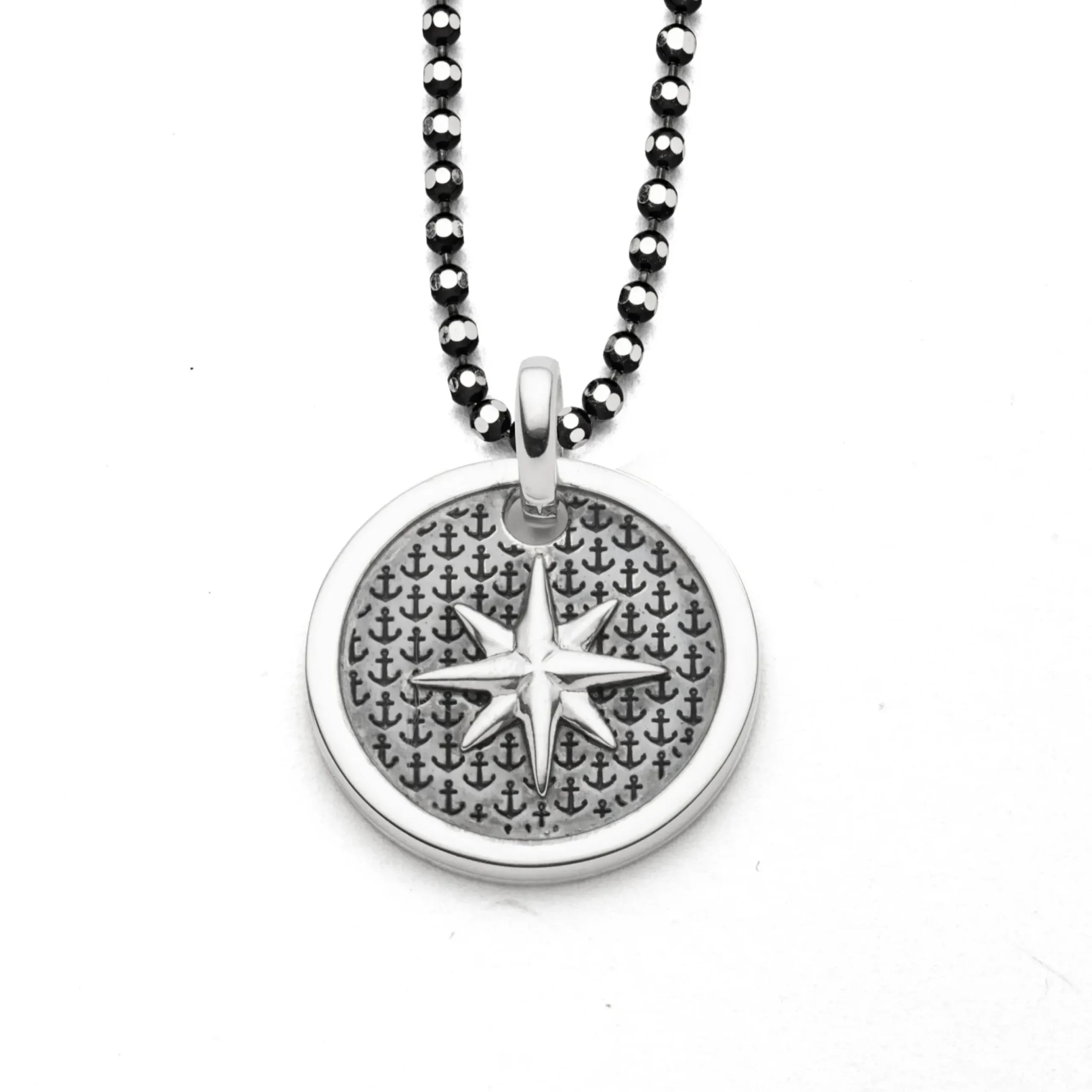 Runder, flacher Anhänger Ankerplatz „Kompass“ mit dem silbernen Motiv: „Kompassrose“ und gelaserten, schwarz oxidierten Anker-Icons im Hintergrund, aus 925er Sterling-Silber.