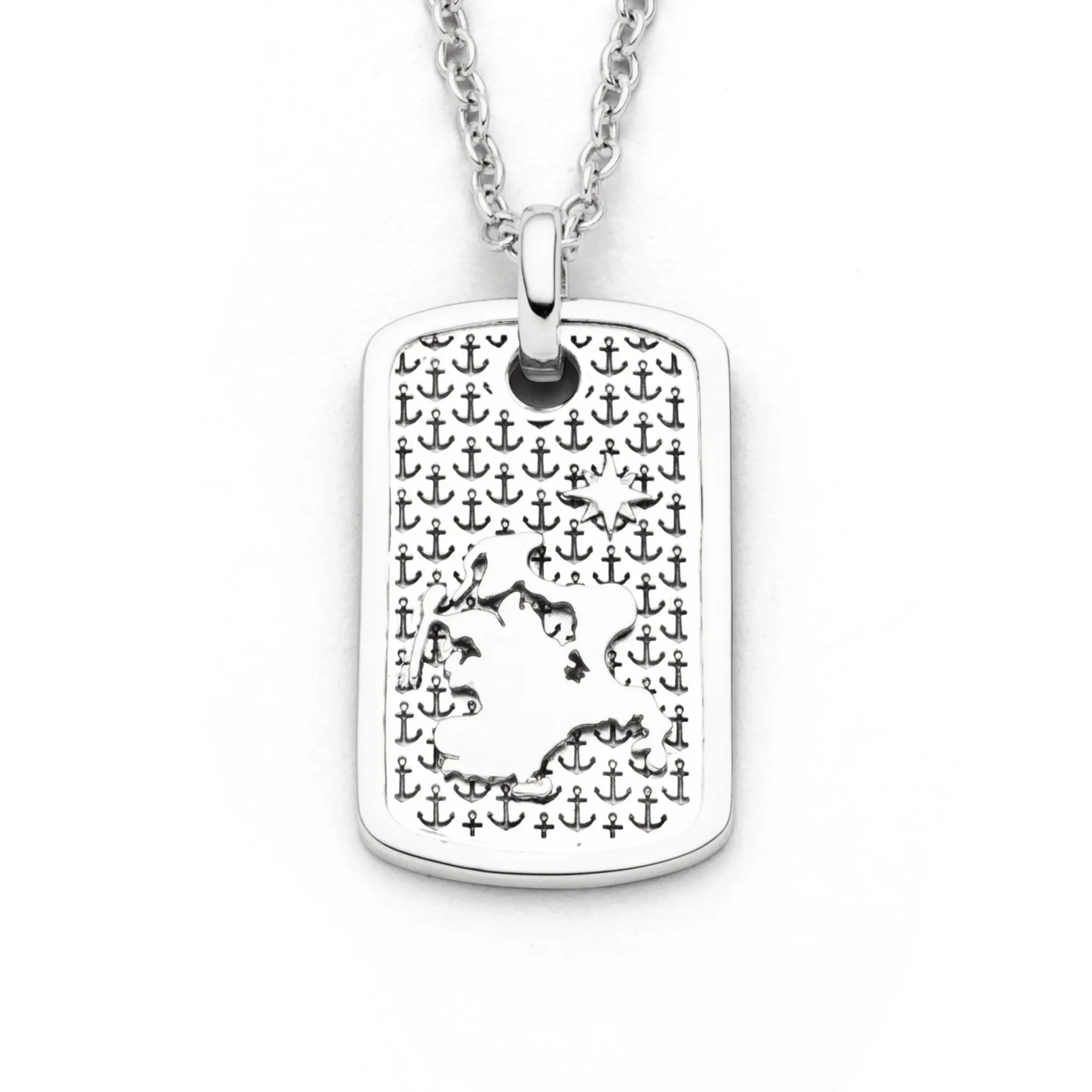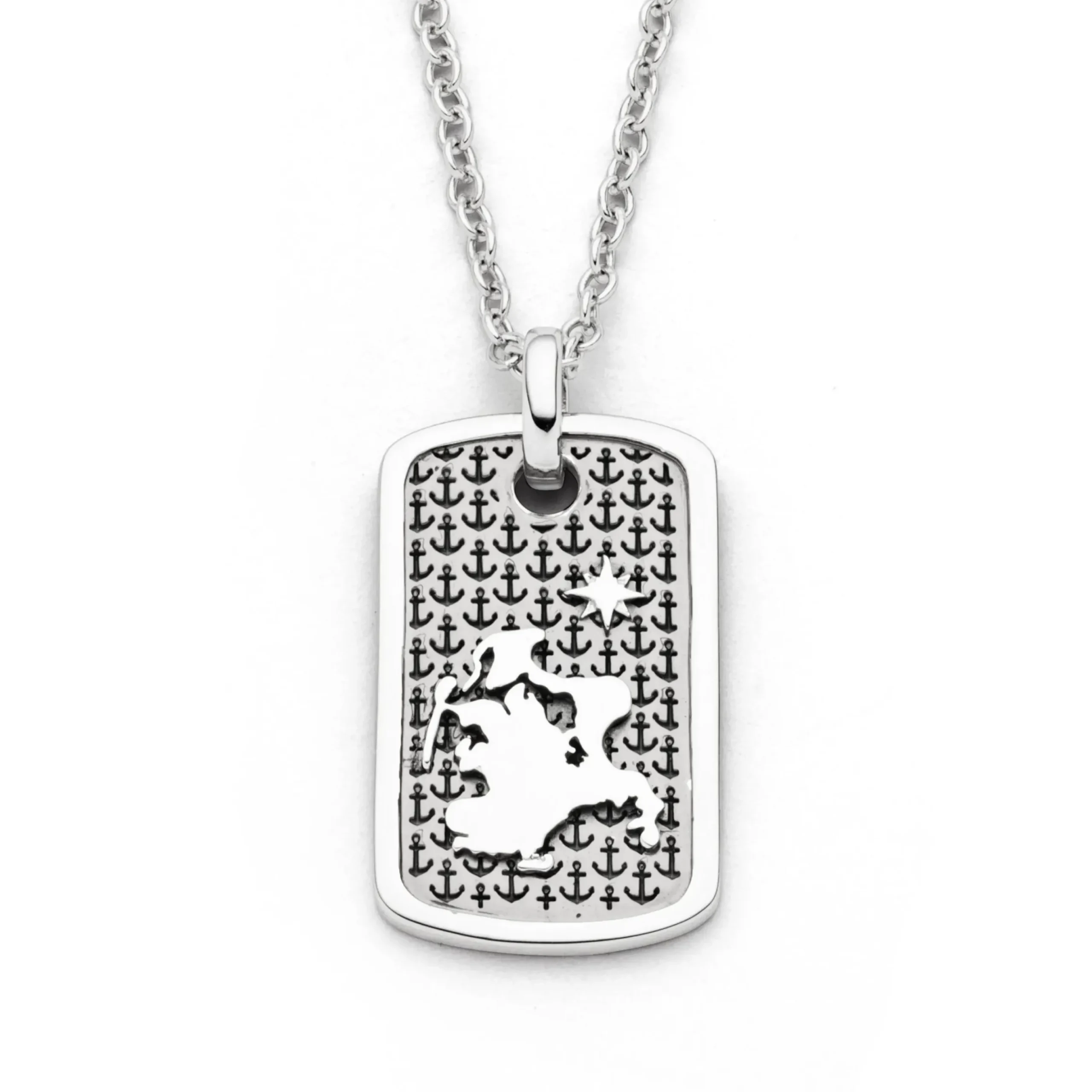 Flacher, rechteckiger Anhänger Ankerplatz „Rügen“ mit dem silbernen Motiv: „Rügensilhouette + Kompassrose“ und gelaserten Anker-Icons im Hintergrund, aus rhodiniertem 925er Sterling-Silber.