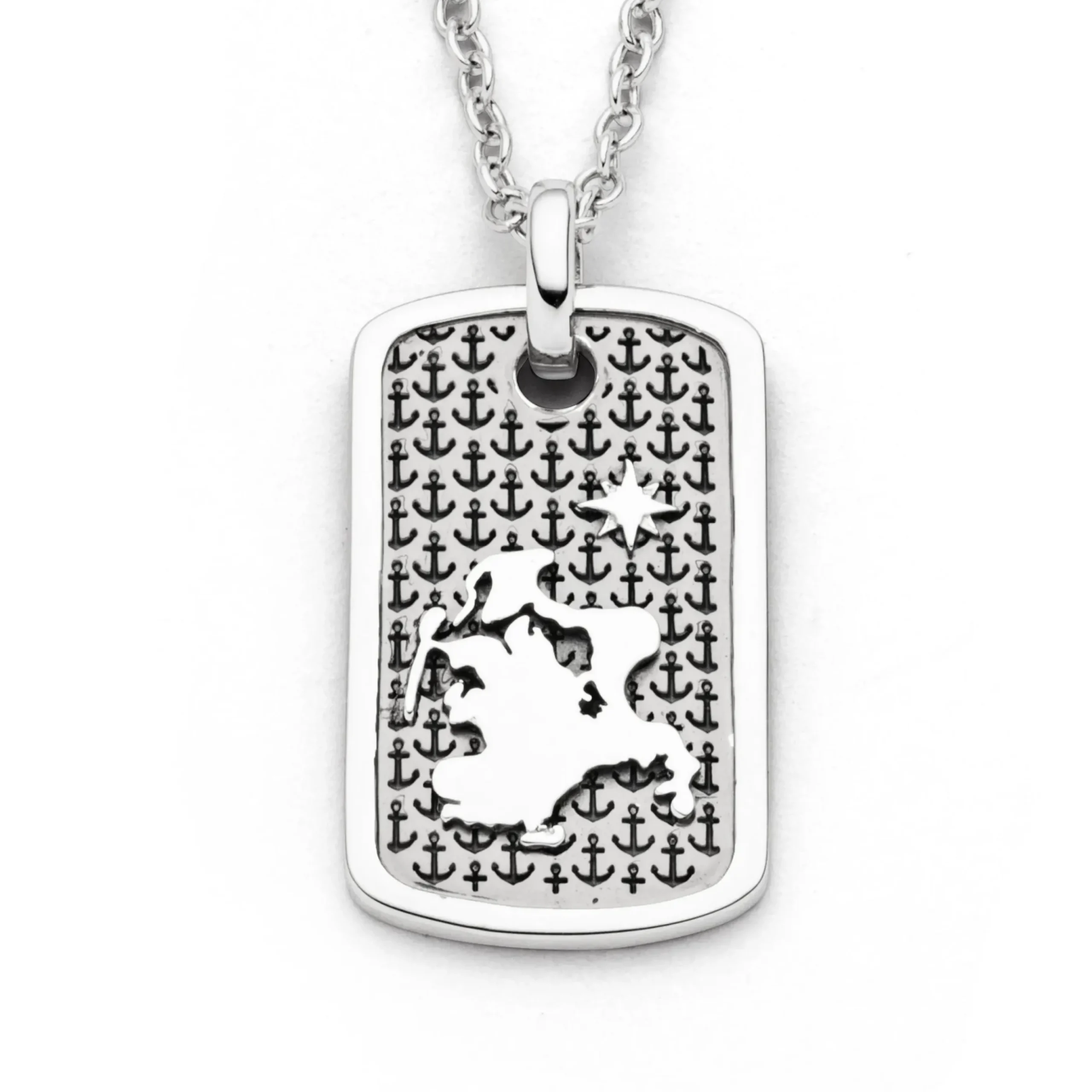 Flacher, rechteckiger Anhänger Ankerplatz „Rügen“ mit dem silbernen Motiv: „Rügensilhouette + Kompassrose“ und gelaserten, schwarz oxidierten Anker-Icons im Hintergrund, aus 925er Sterling-Silber.