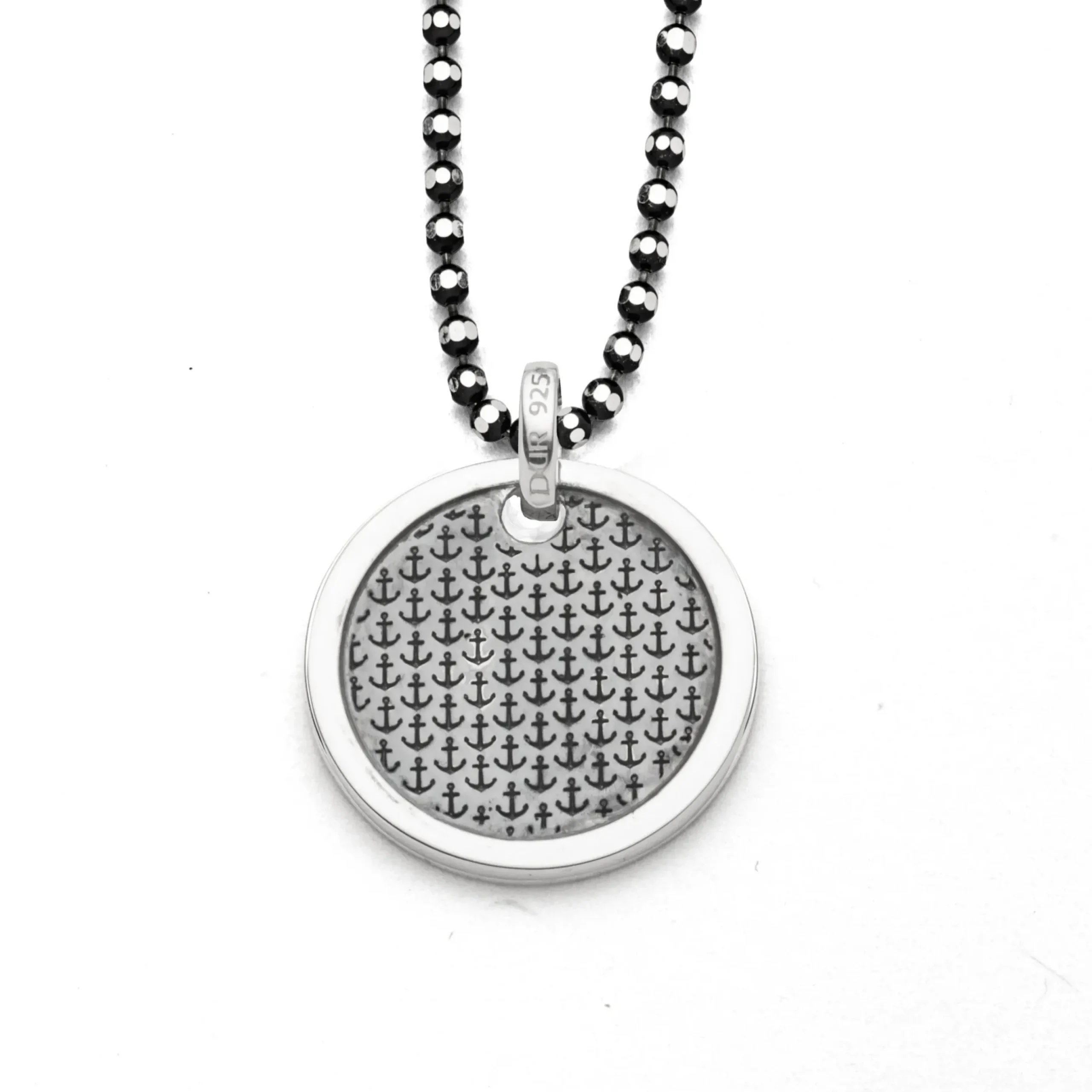 Flacher, runder Anhänger „Ankerplatz“ mit kleinen, gelaserten, oxidierten Anker-Icons als Hintergrund, aus 925er Sterling-Silber.
