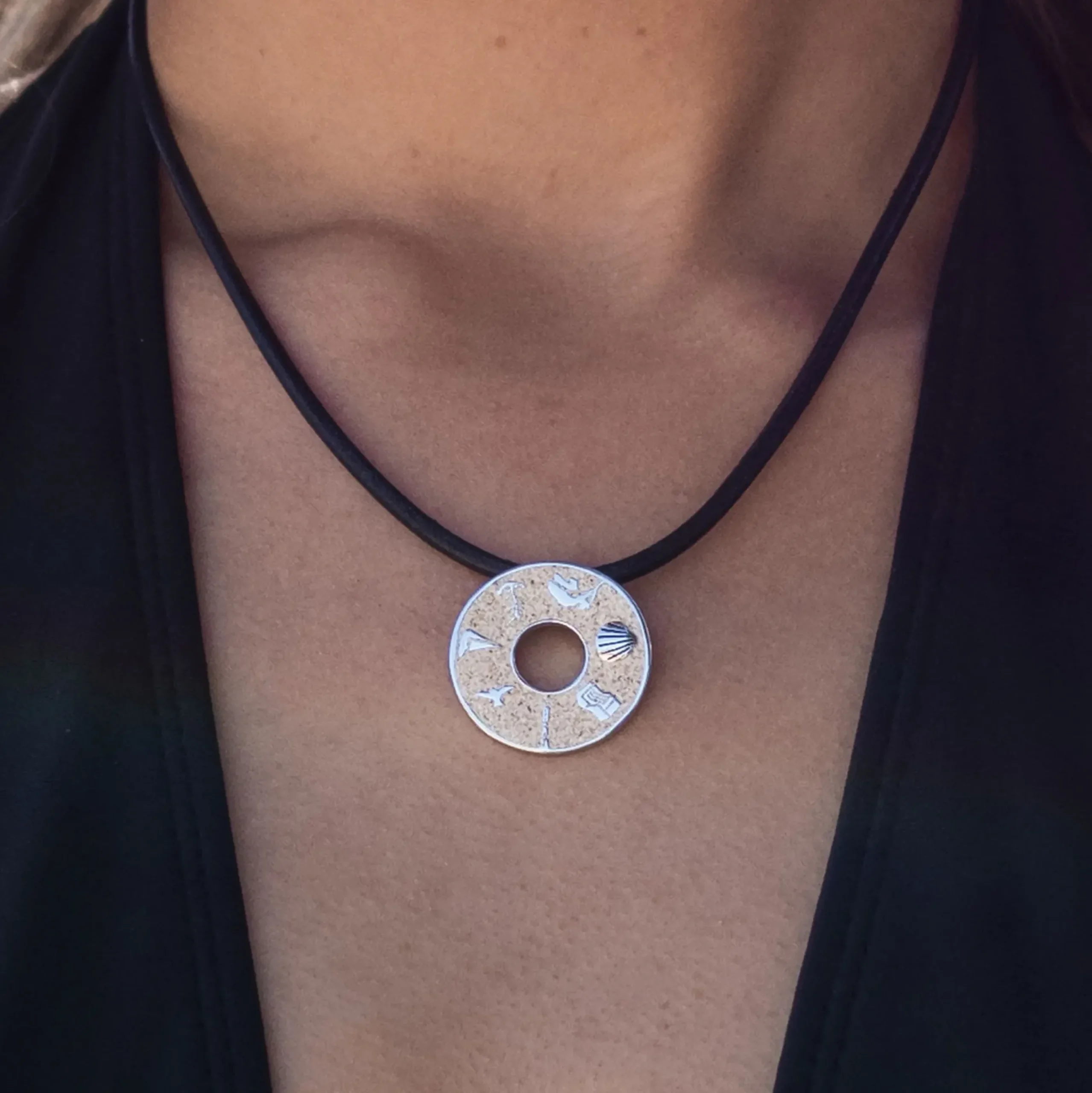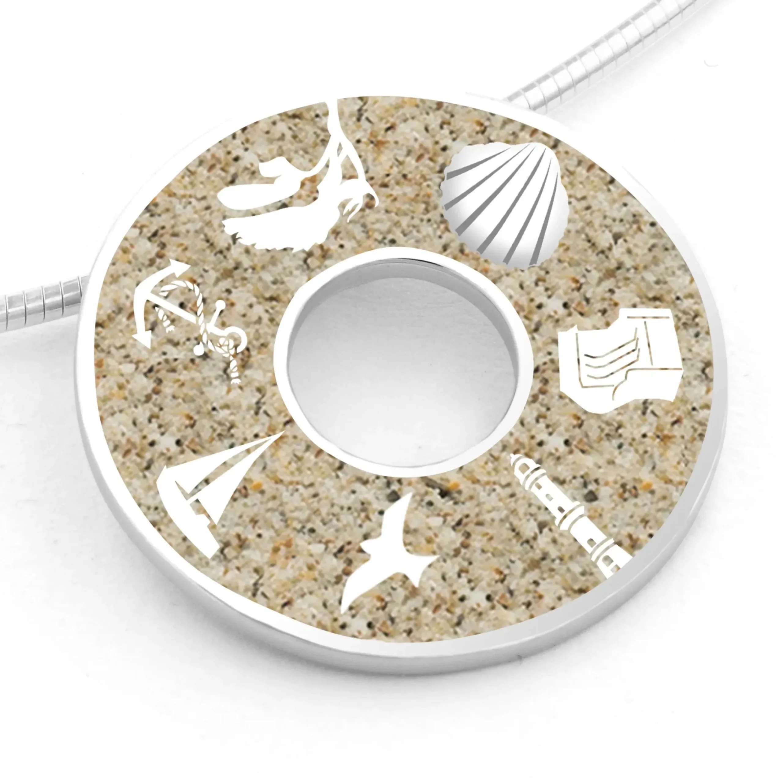 Runder Anhänger „Ostsee“ mit den Motiven: Anker – Windflüchter – Muschel – Strandkorb – Leuchtturm – Möwe – Segelboot, mit Kettenöse auf der Rückseite, eingebettet in Strandsand, gefasst in poliertem und rhodiniertem 925er Sterling-Silber