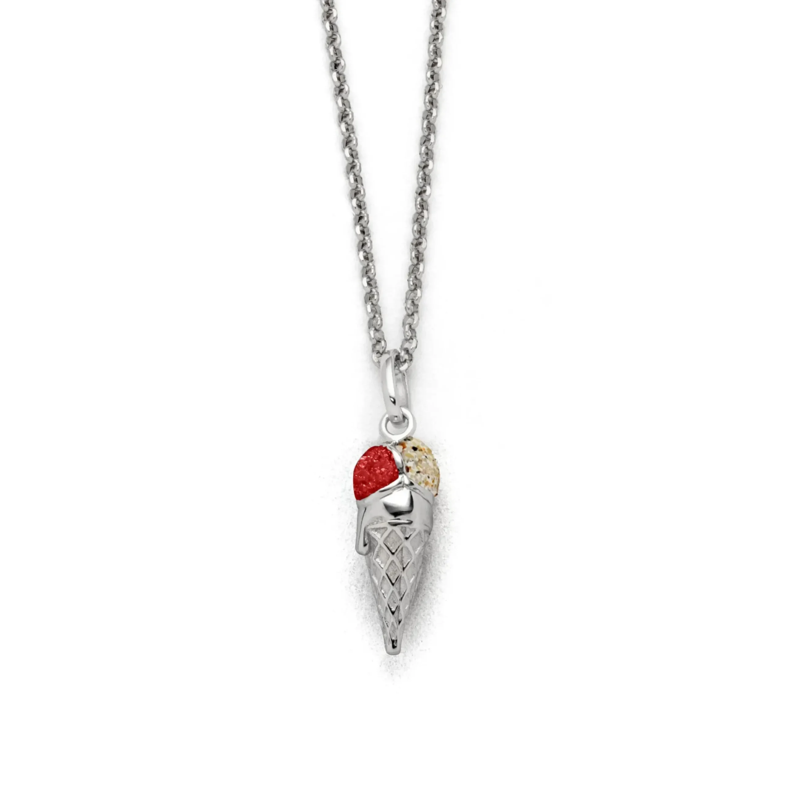 Echte Sehnsucht: Anhänger in Form einer Eistüte, teilweise gefüllt mit Strandsand und Korallengranulat, alles aus poliertem und rhodiniertem 925er Sterling-Silber