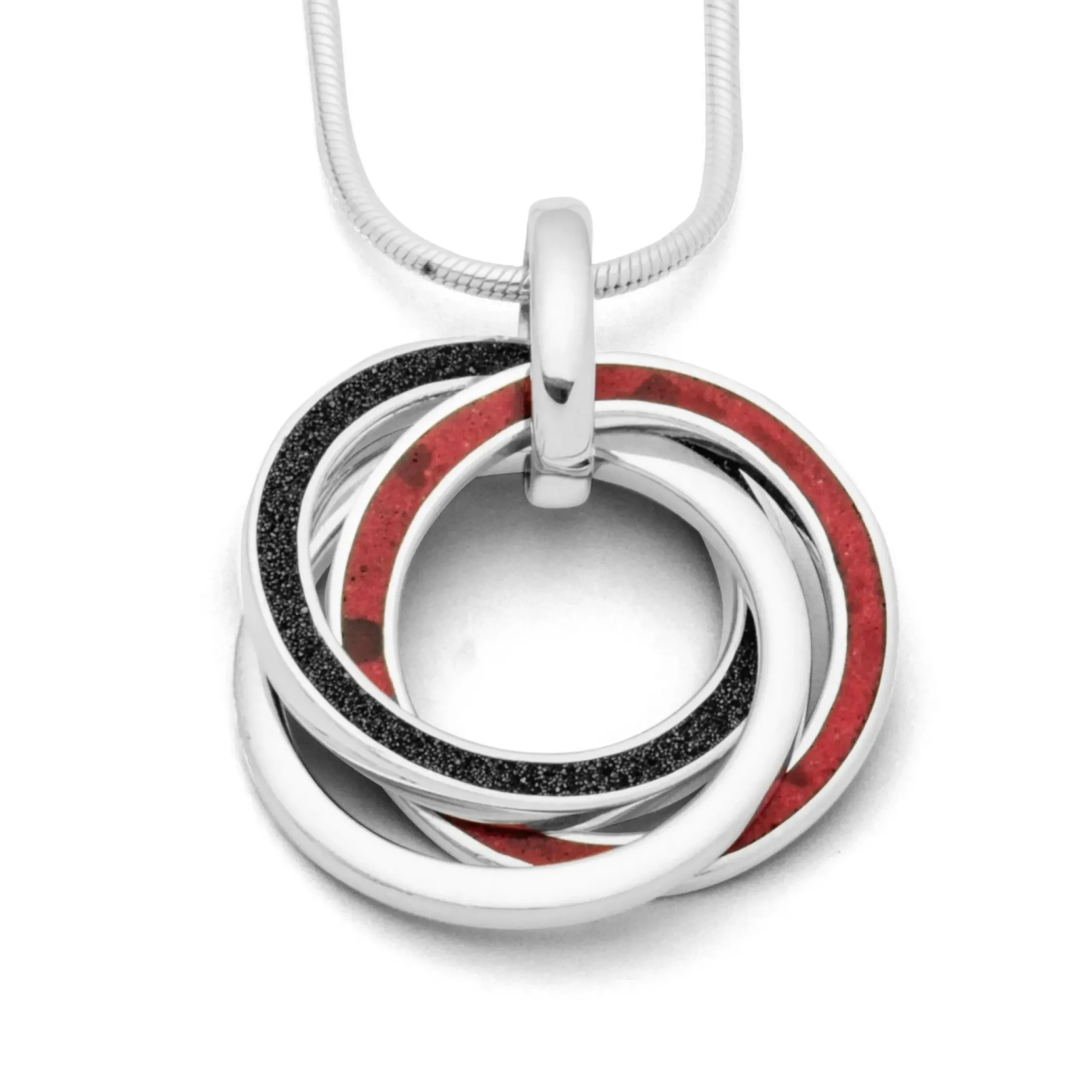 Anhänger „Erde und Feuer“ aus rhodiniertem 925er Sterling-Silber, bestehend aus 3 ineinander verschlungenen Ringen, gefüllt mit Koralle, Lavasand und Silber