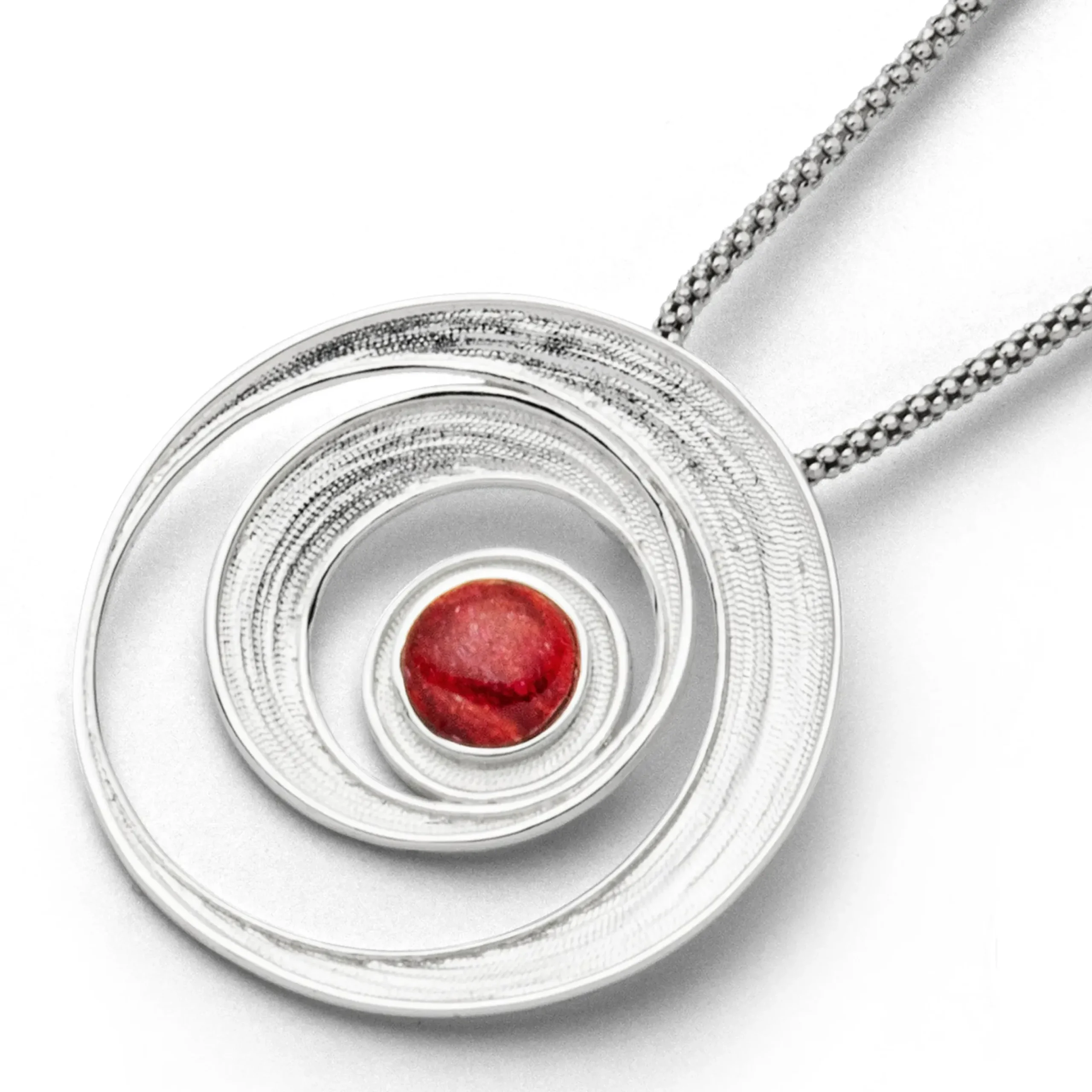Spiralförmiger, leicht strukturierter Anhänger „Feuerstrudel“ mit einem roten Korallenstein und einer an der Rückseite versteckt angebrachter Öse, aus anlaufgeschütztem (e-coating) 925er Sterling-Silber