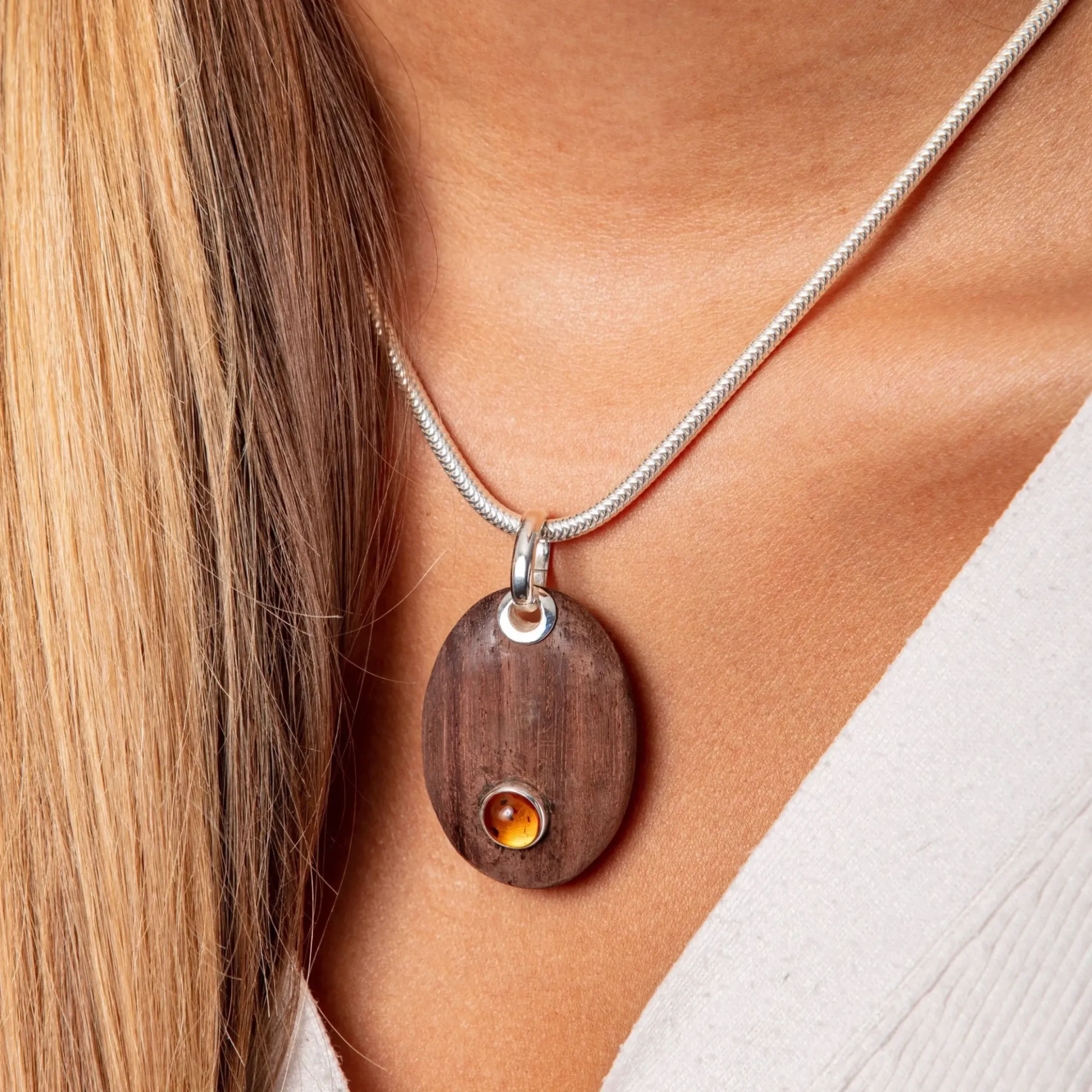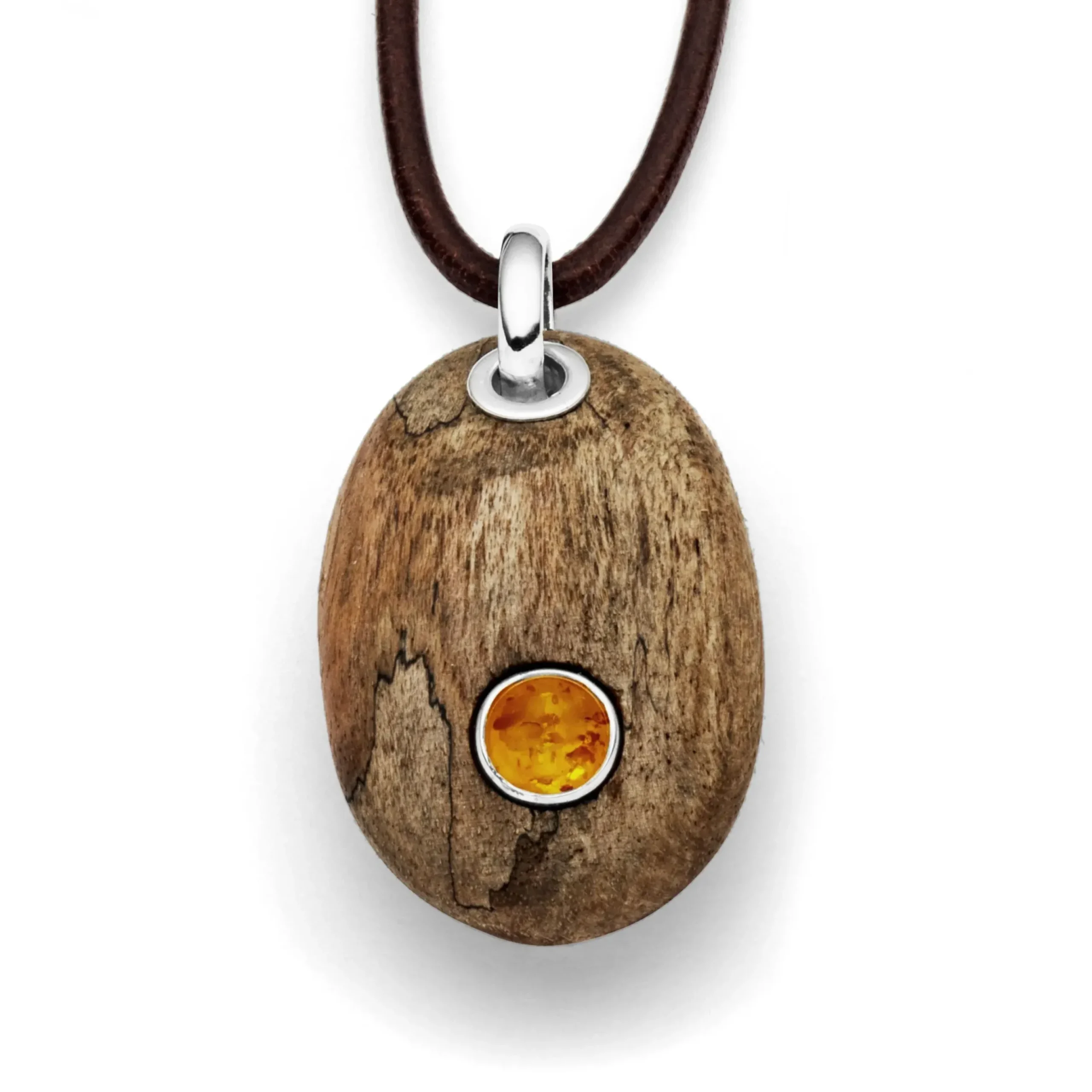Ovaler Anhänger aus Treibholz mit großer silbernen Öse, in der Mitte einen runden Bernstein gefaßt in 925er Sterling-Silber