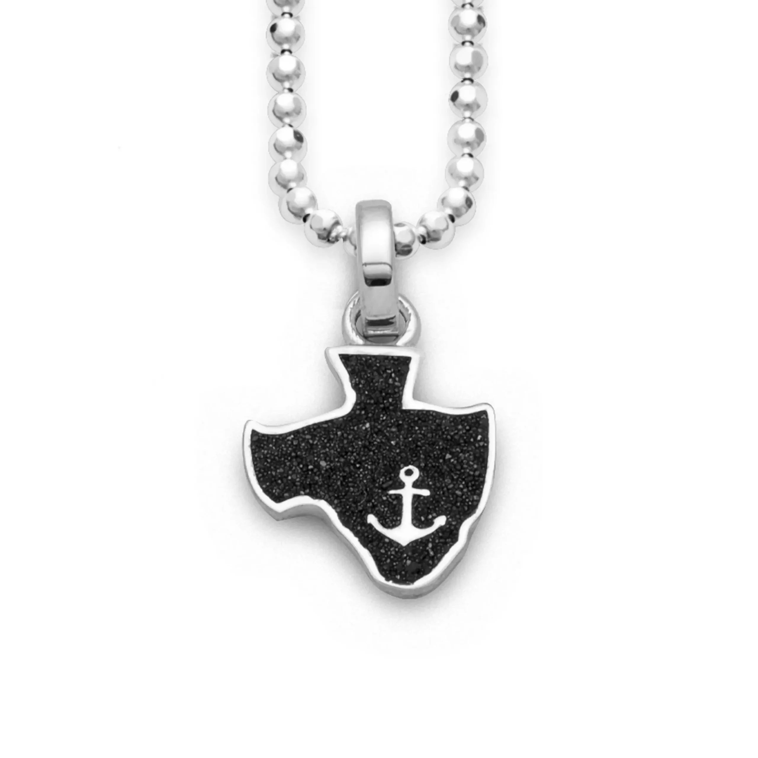 Wellen, Wind und Wattenmeer – der durch viele Sturmfluten entstandene Jadebusen ist eine der letzten offenen Meeresbuchten der Wattenmeerküste und fasziniert mit abwechslungsreicher Landschaft, sowie einmaligen Natur und Kulturschätzen.Als Erinnerung an schöne Urlaubsmomente, aber auch für alle die Meer und Strand lieben, oder ein maritimes Statement setzen möchten, ist dieses schöne Schmuckstück unverzichtbar.Der elegante Anhänger ist eine Hommage an diesen einzigartigen Küstenlebensraum und beeindruckt mit hochwertiger Verarbeitung, sowie durch die außergewöhnliche Materialkombination von glitzerndem Lavasand und edlem, rhodinierten 925er Sterling Silber.In glanzvollem Design präsentiert sich der Anhänger in „Jadebusen“ – Silhouette, gefüllt mit feinem Lavasand und einer silbernen Ankerverzierung als Blickfang. Mit einem Ösendurchmesser von 5 mm lässt sich der zeitlose Anhänger mit verschiedenen Ketten kombinieren und ist somit ein toller Begleiter, der jedem Dekolleté eine umwerfende Ausstrahlung verleiht.