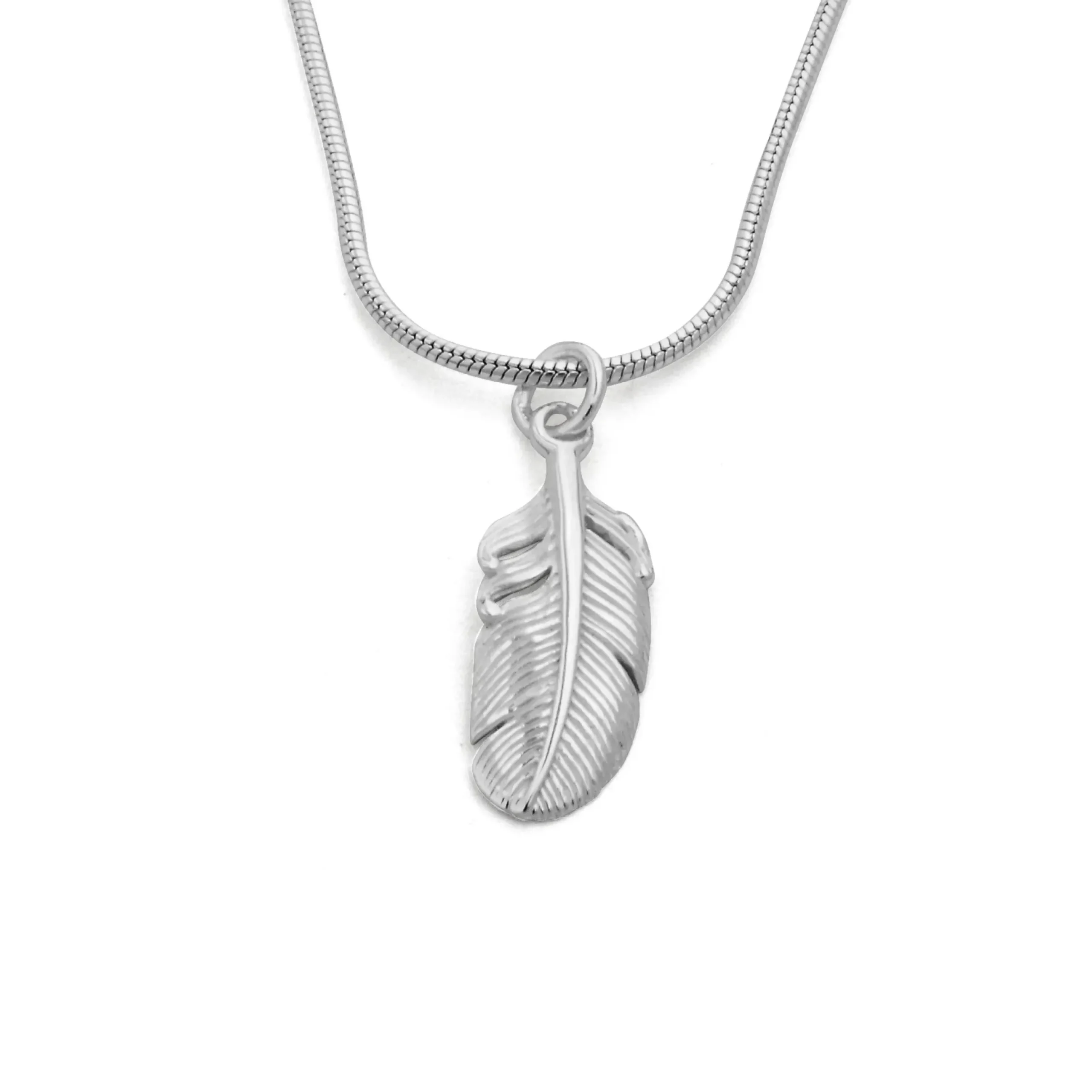 Anhänger „Feder“, mittelgroß, aus poliertem, rhodiniertem 925er Sterling-Silber. Einzeln tragbar oder als Kombination mit anderen Schmuckstücken.