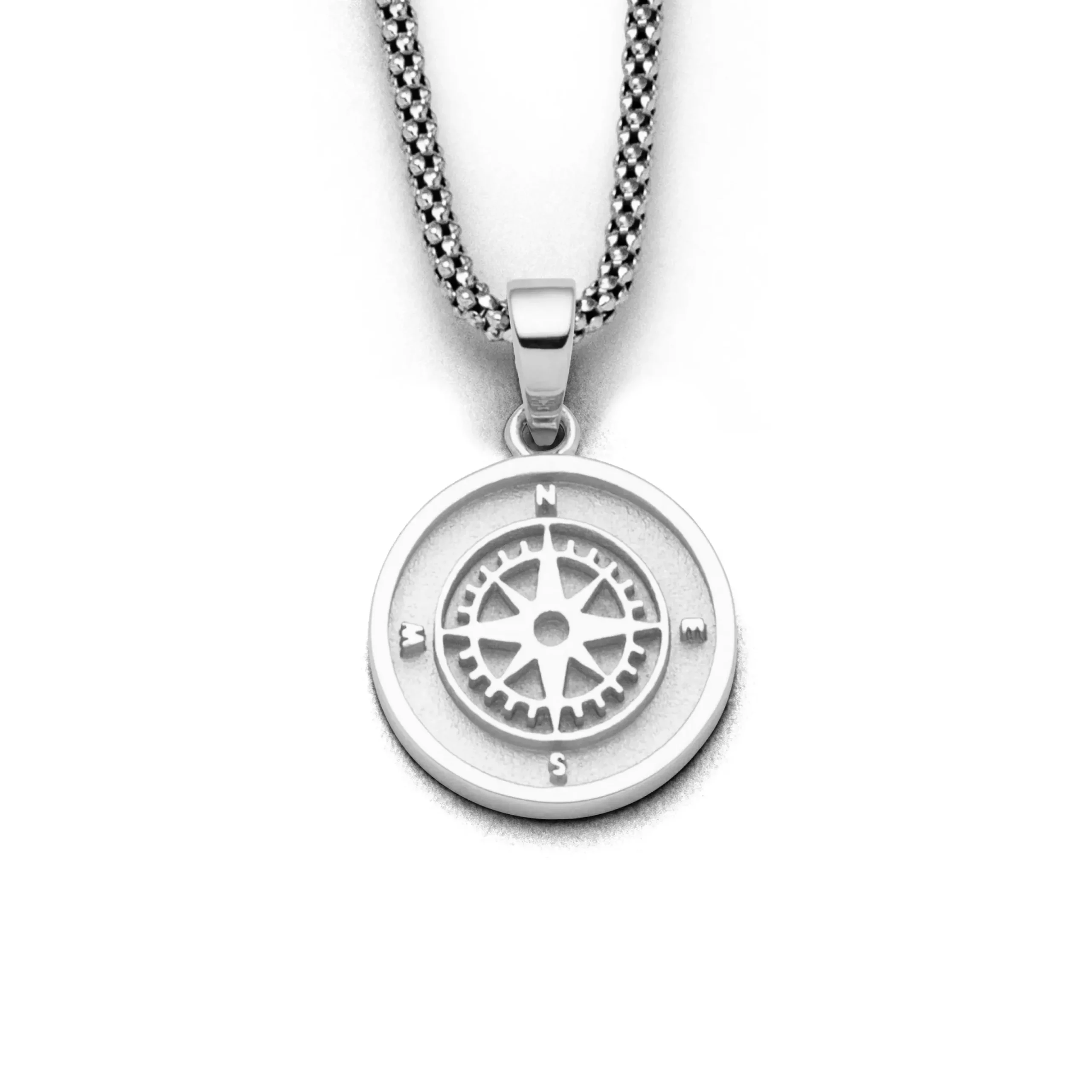Runder Anhänger „Kompassrose 2.0“, innen satiniert, mit einer Kompassrose, aus poliertem und hell rhodiniertem 925er Sterling-Silber