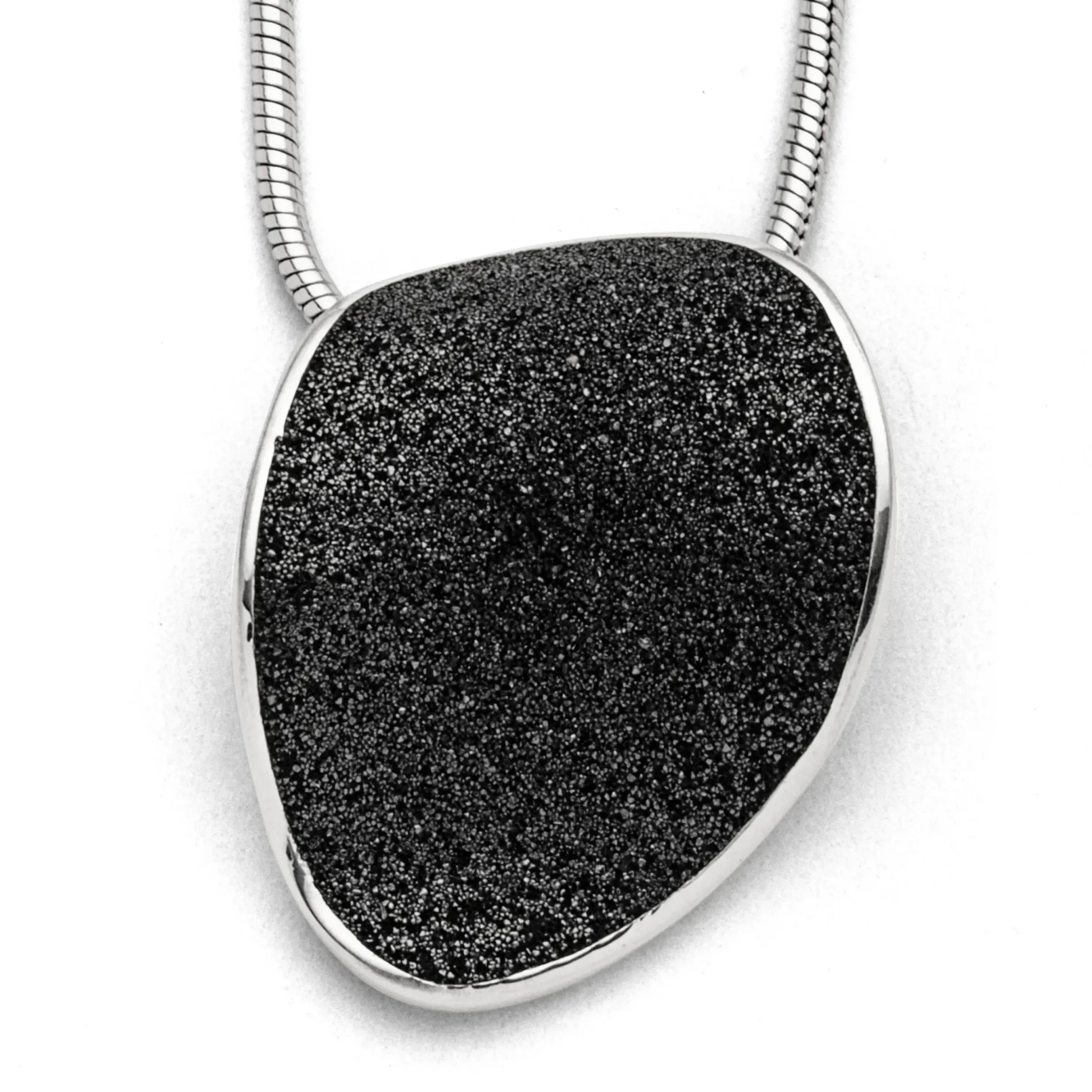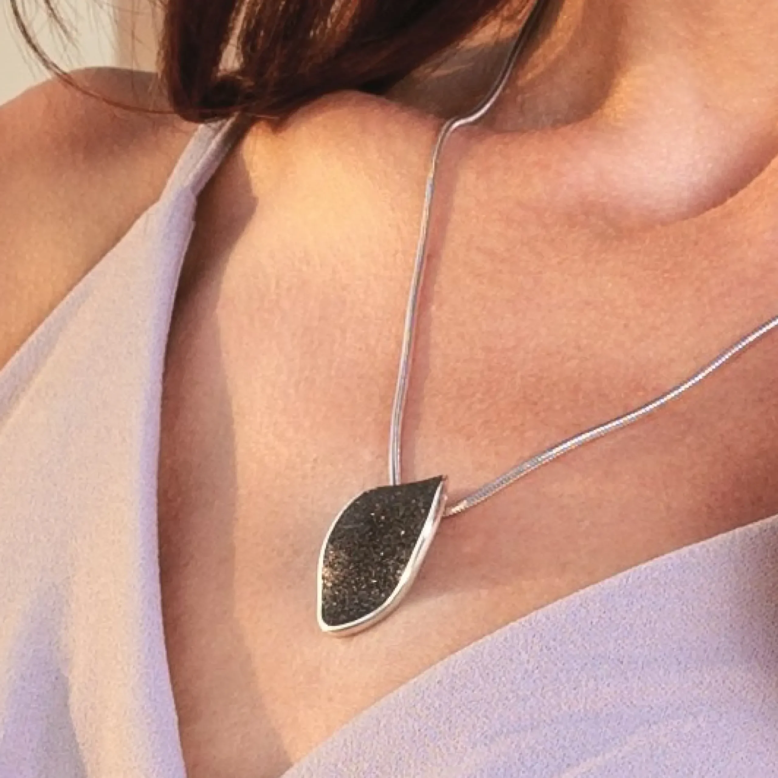 „Lavainsel“ Anhänger in Form einer Insel mit Lavasand gefüllt, aus rhodiniertem 925er Sterlingsilber.