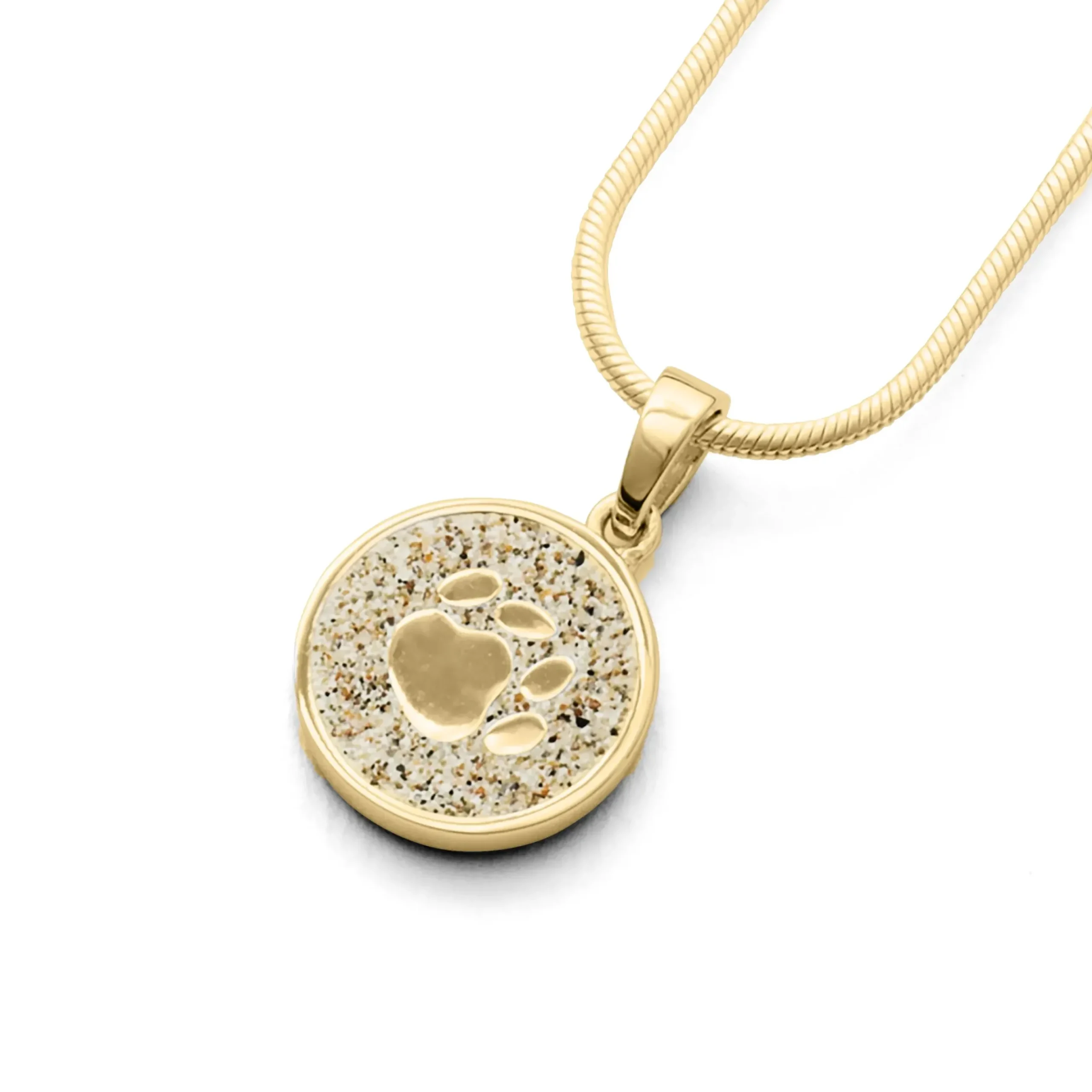 Runder Anhänger „Lucky Dog“ mit einer Hundepfote und gefüllt mit Strandsand. Alles gefasst in vergoldetem 925er Silber