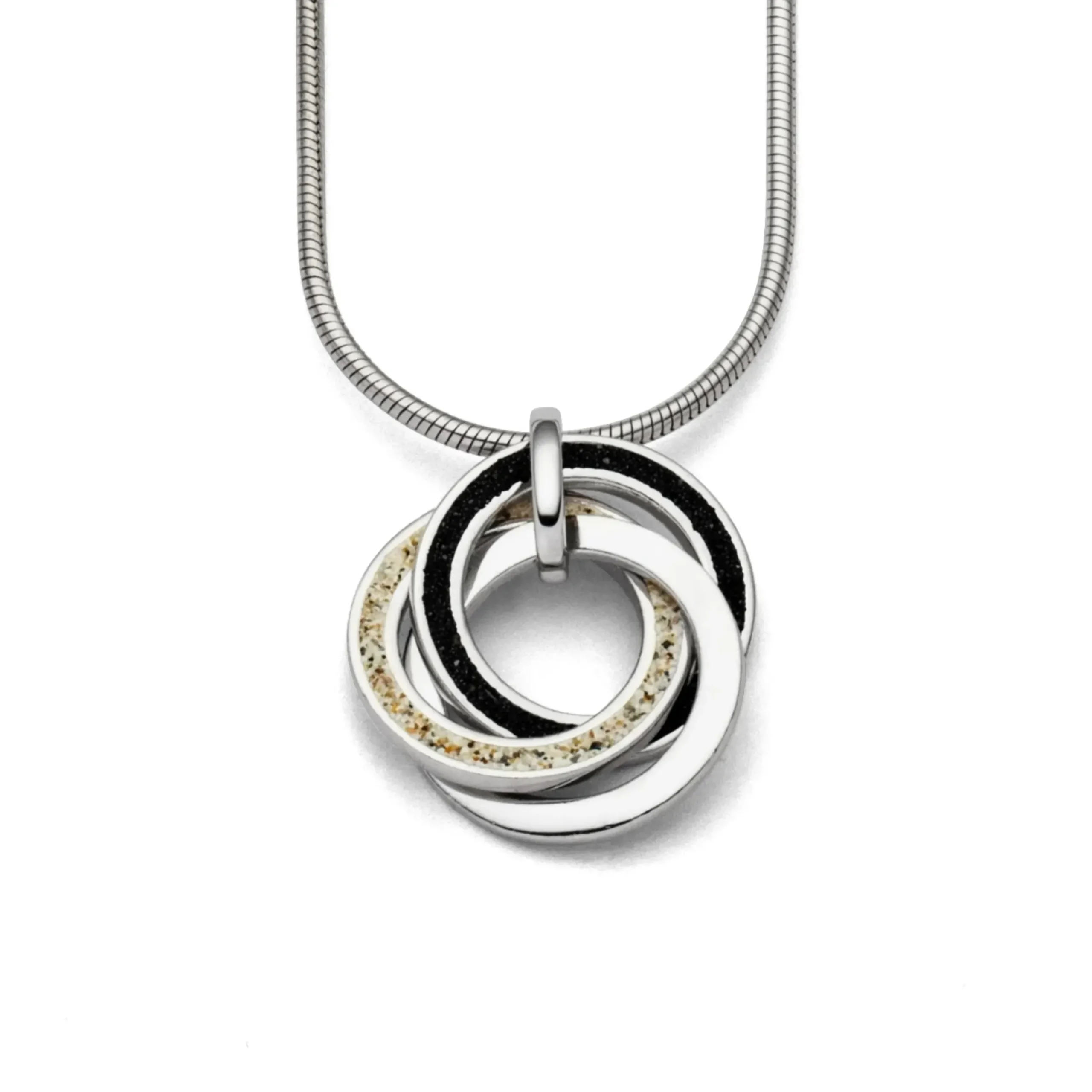 Anhänger „Marina“ aus rhodiniertem 925er Sterling-Silber, bestehend aus 3 ineinander verschlungenen Ringen, gefüllt mit Strandsand, Lavasand und Silber