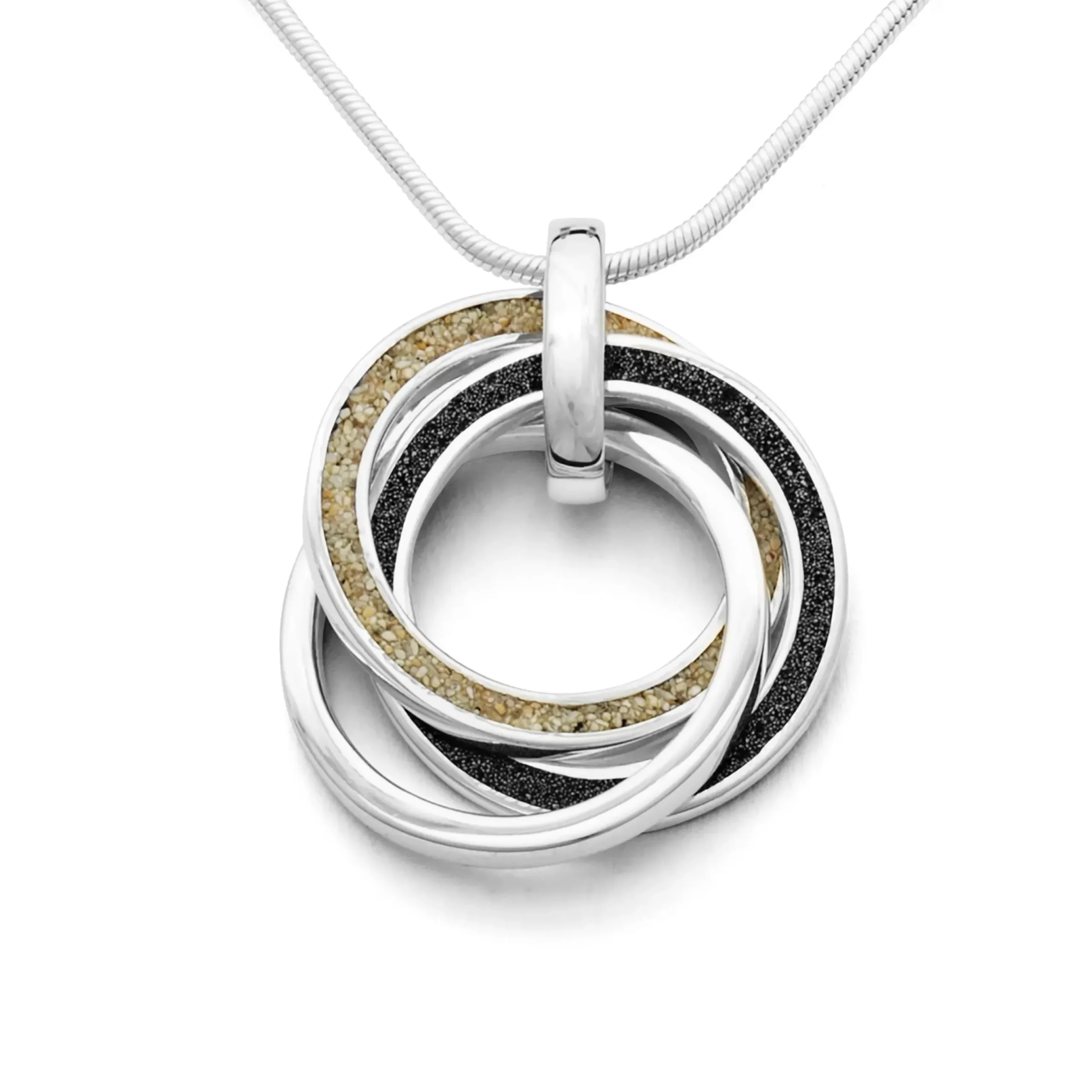 Anhänger „Marina“ aus rhodiniertem 925er Sterling-Silber, bestehend aus 3 ineinander verschlungenen Ringen, gefüllt mit Strandsand, Lavasand und Silber