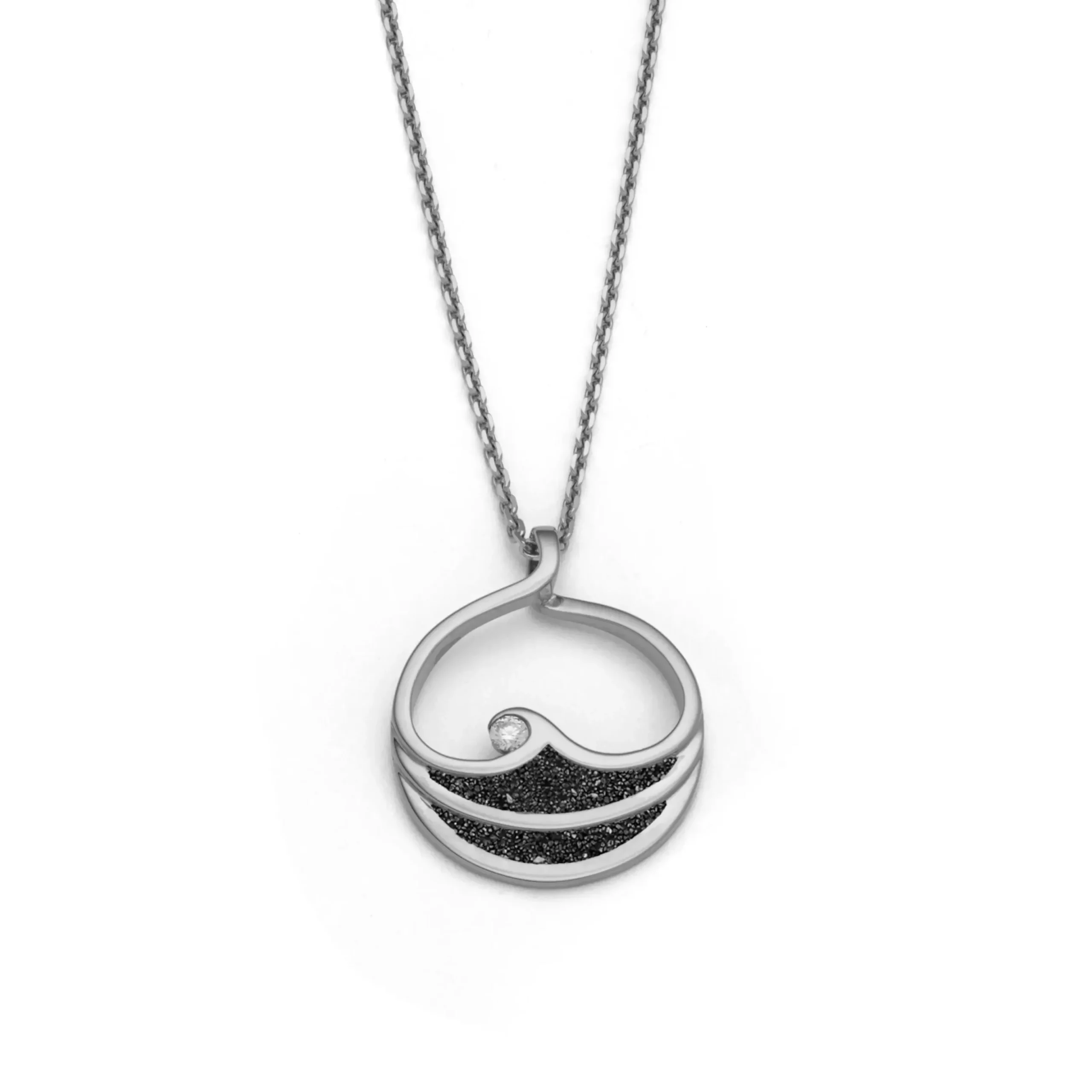 Anhänger „Maui“, runder Anhänger, mit zwei Wellen, diese sind mit Lavasand gefüllt, als Wellenbrecher ist ein 3 mm Zirkonia positioniert, alles gefasst in rhodiniertem 925er Sterlingsilber