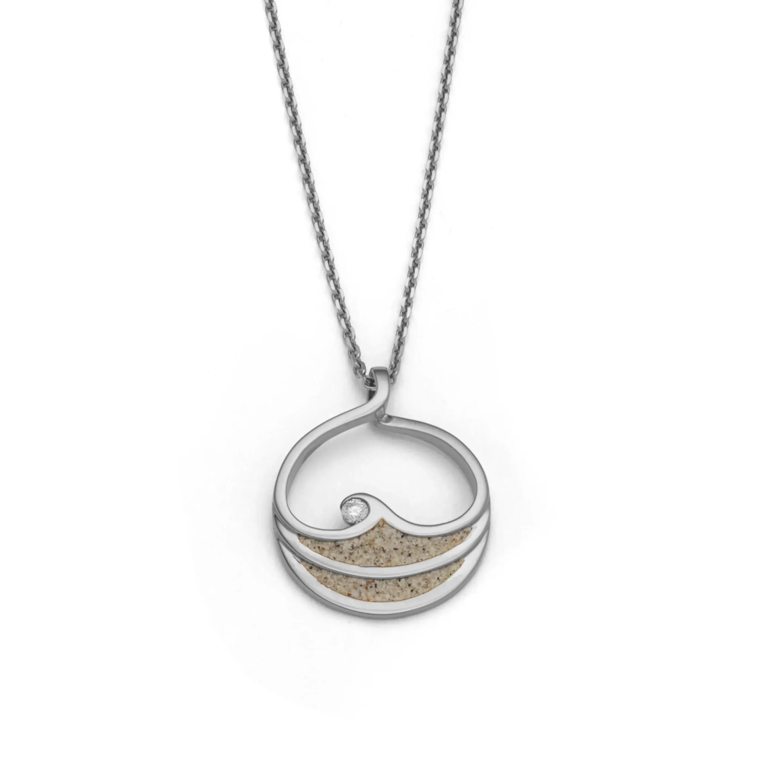 Anhänger „Maui“, runder Anhänger, mit zwei Wellen, diese sind mit Strandsand gefüllt, als Wellenbrecher ist ein 3 mm Zirkonia positioniert, alles gefasst in rhodiniertem 925er Sterlingsilber