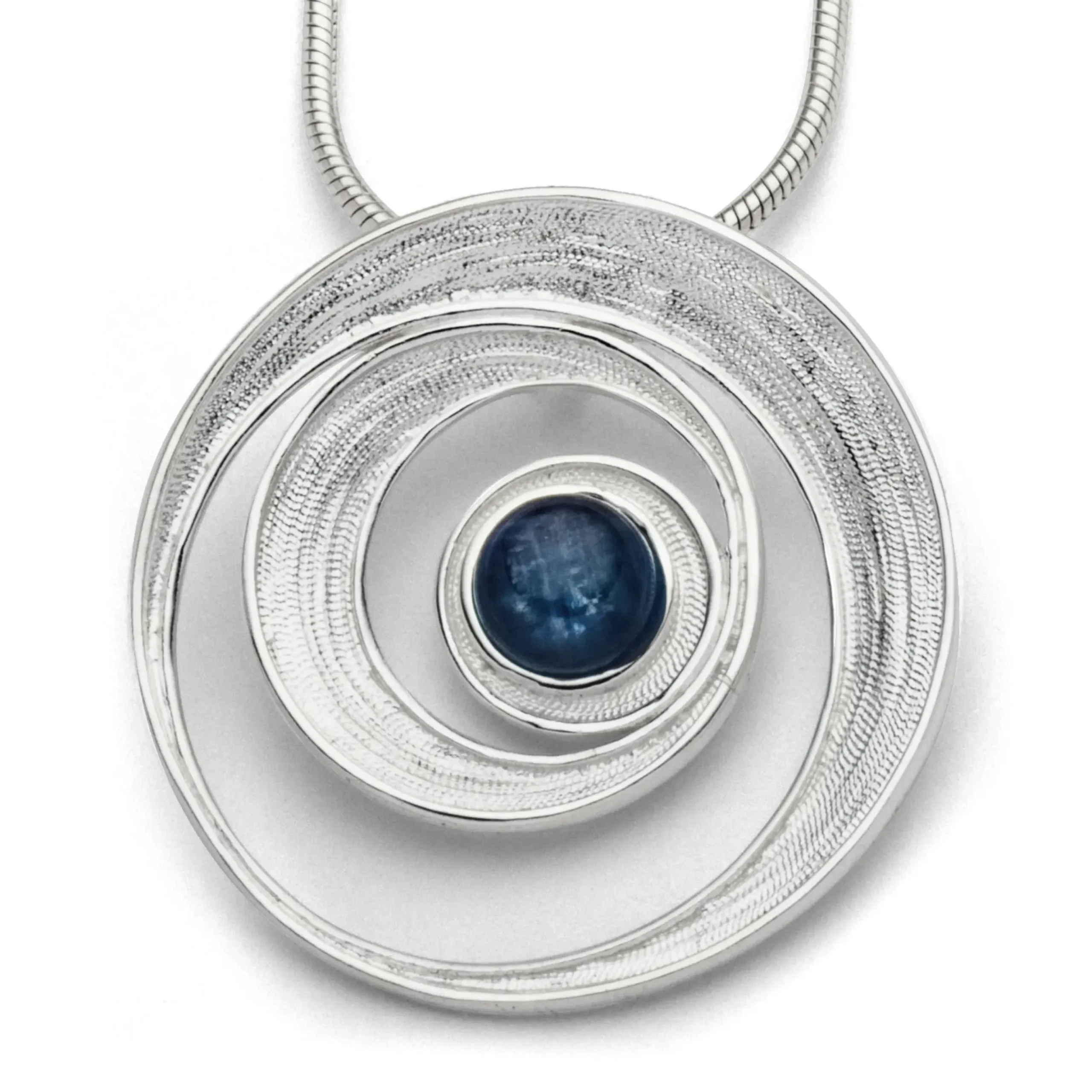 Spiralförmiger, leicht strukturierter Anhänger „Meeresstrudel“ mit einem blauen Kyanit und einer an der Rückseite versteckt angebrachter Öse, aus anlaufgeschütztem (e-coating) 925er Sterling-Silber