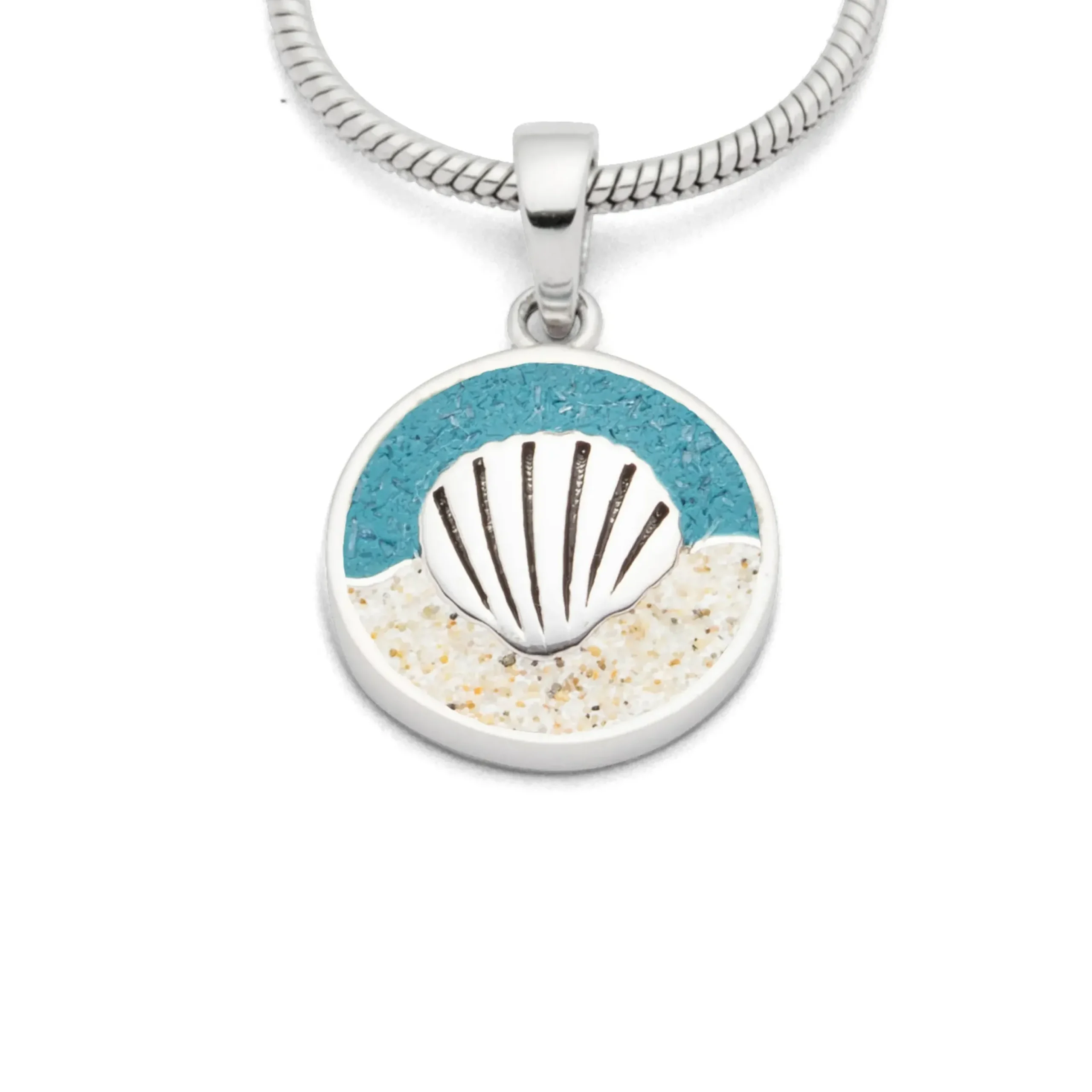 Anhänger „Muschel“, kleiner runder Anhänger mit einer „Muschel“ als Motiv, in Strandsand und blauem Steinsand eingebettet und gefaßt in rhodiniertem 925er Silber