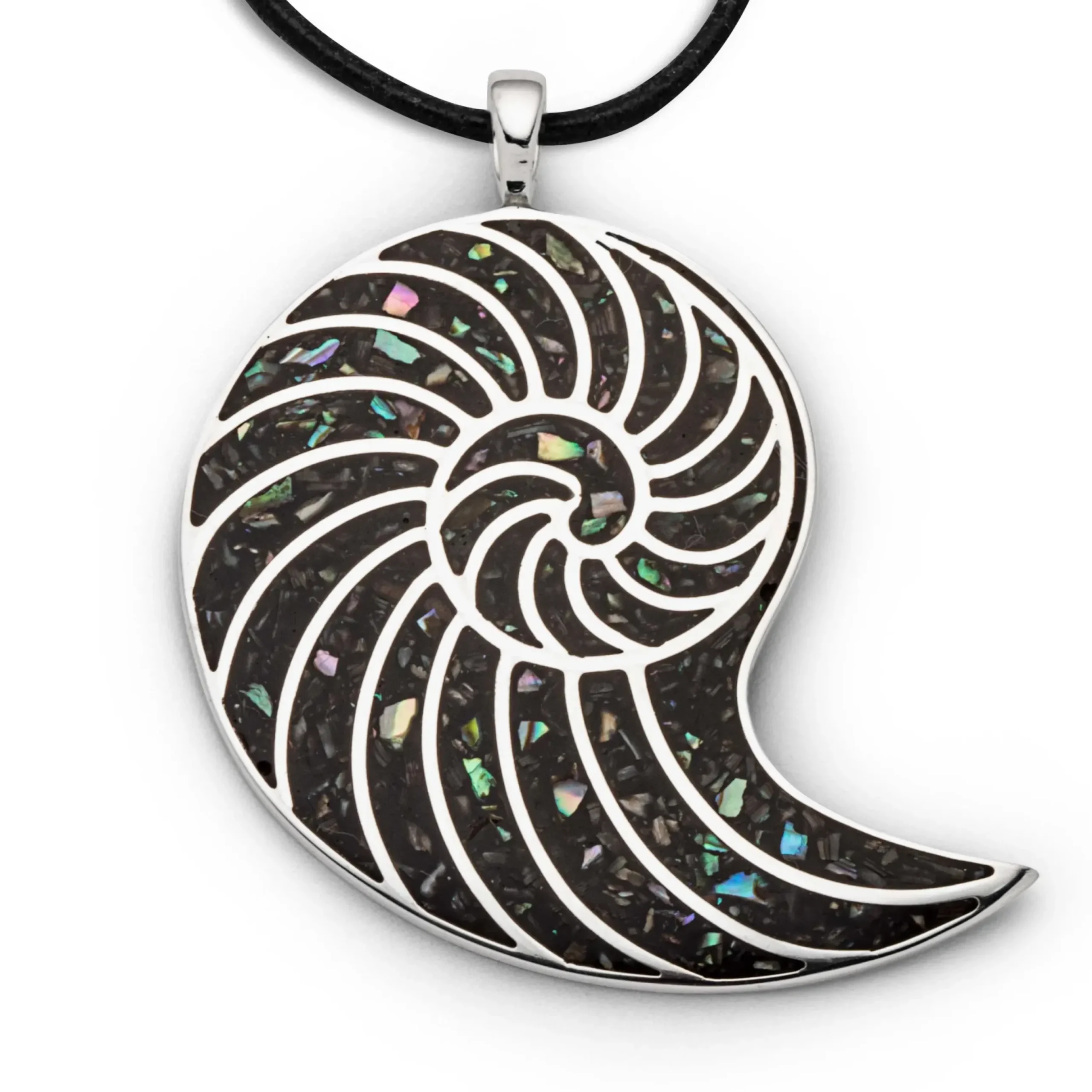 Großer, handgefertigter Anhänger in Nautilusform, gefüllt mit Mosaik-Seeopal und gefasst in 925er Sterling-Silber.