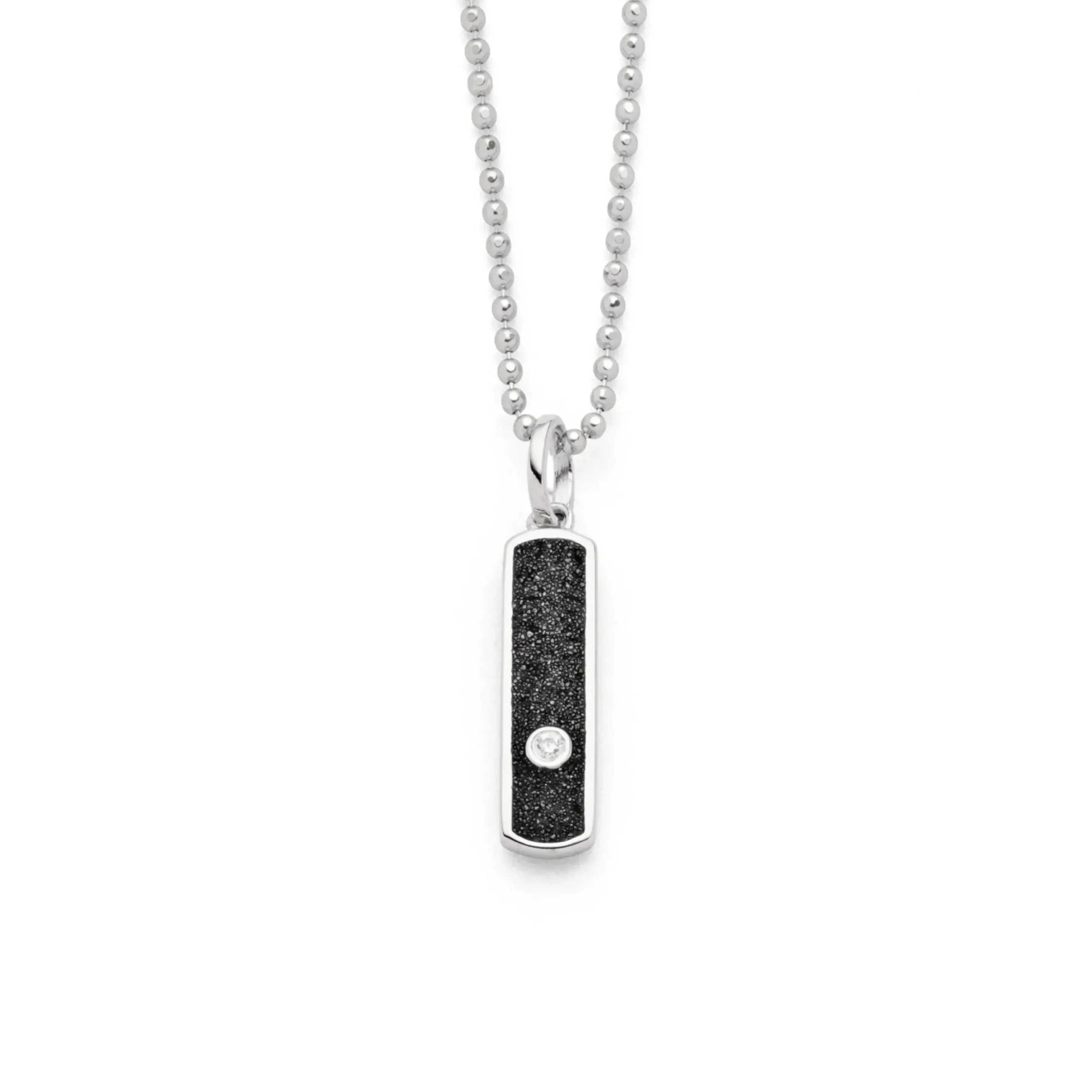 Länglicher Anhänger „Nordlicht“ mit einem in Lavasand gebetteten Zirkoniastein, gefaßt in rhodiniertem 925er Sterlingsilber.