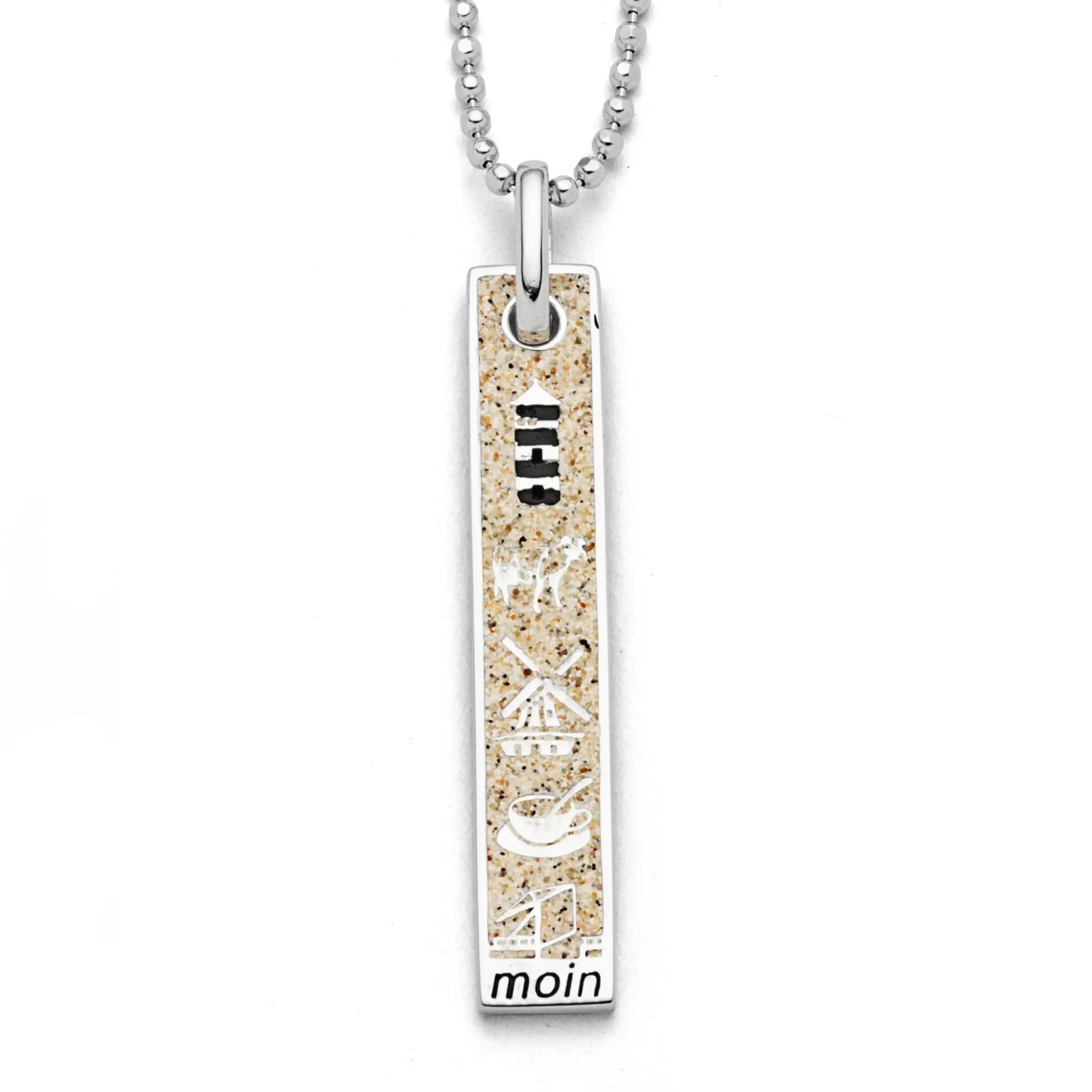 Länglicher Anhänger „Ostfriesland“ mit den Motiven: Kuh (Wittmund) – Windmühle (Aurich) – Teetasse (Leer) – Leuchtturm (Pilsum) – Fehnbrücke (Wiesmoor), eingebettet in Strandsand und gefaßt in rhodiniertem 925er Sterlingsilber.