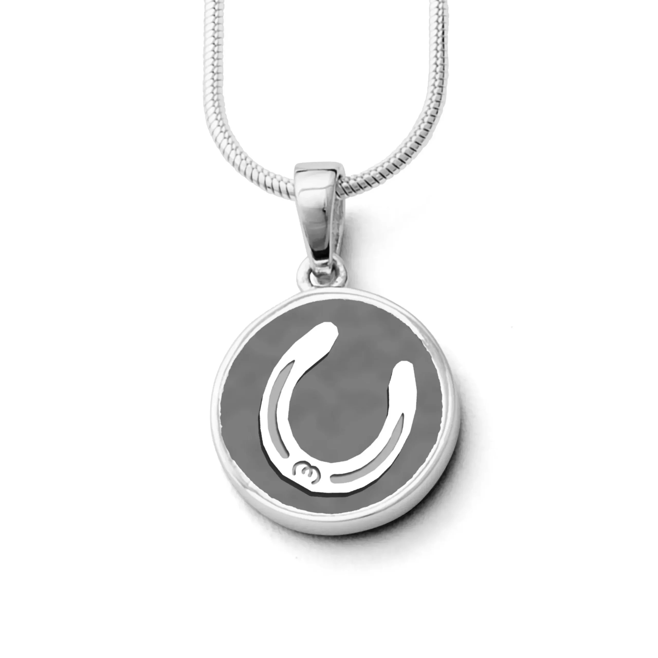 Runder Anhänger Pferdeglück „Hufeisen“ mit einem Hufeisen aus Silber, innen dunkel rhodiniert und gefasst in rhodiniertem 925er Silber