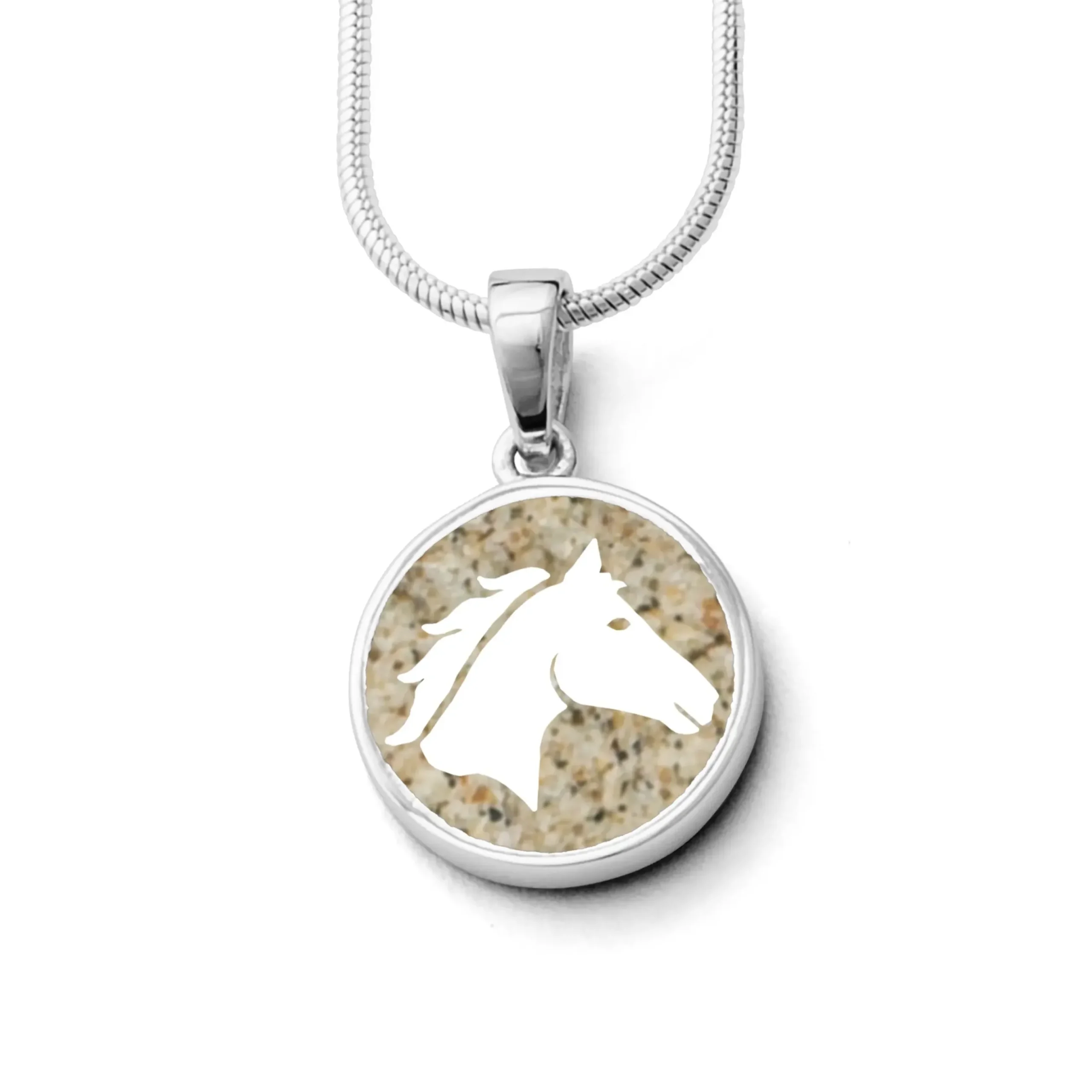 Runder Anhänger „Pferdeglück“ gefüllt mit Strandsand und einem Pferdekopf aus Silber, gefasst in rhodiniertem 925er Silber