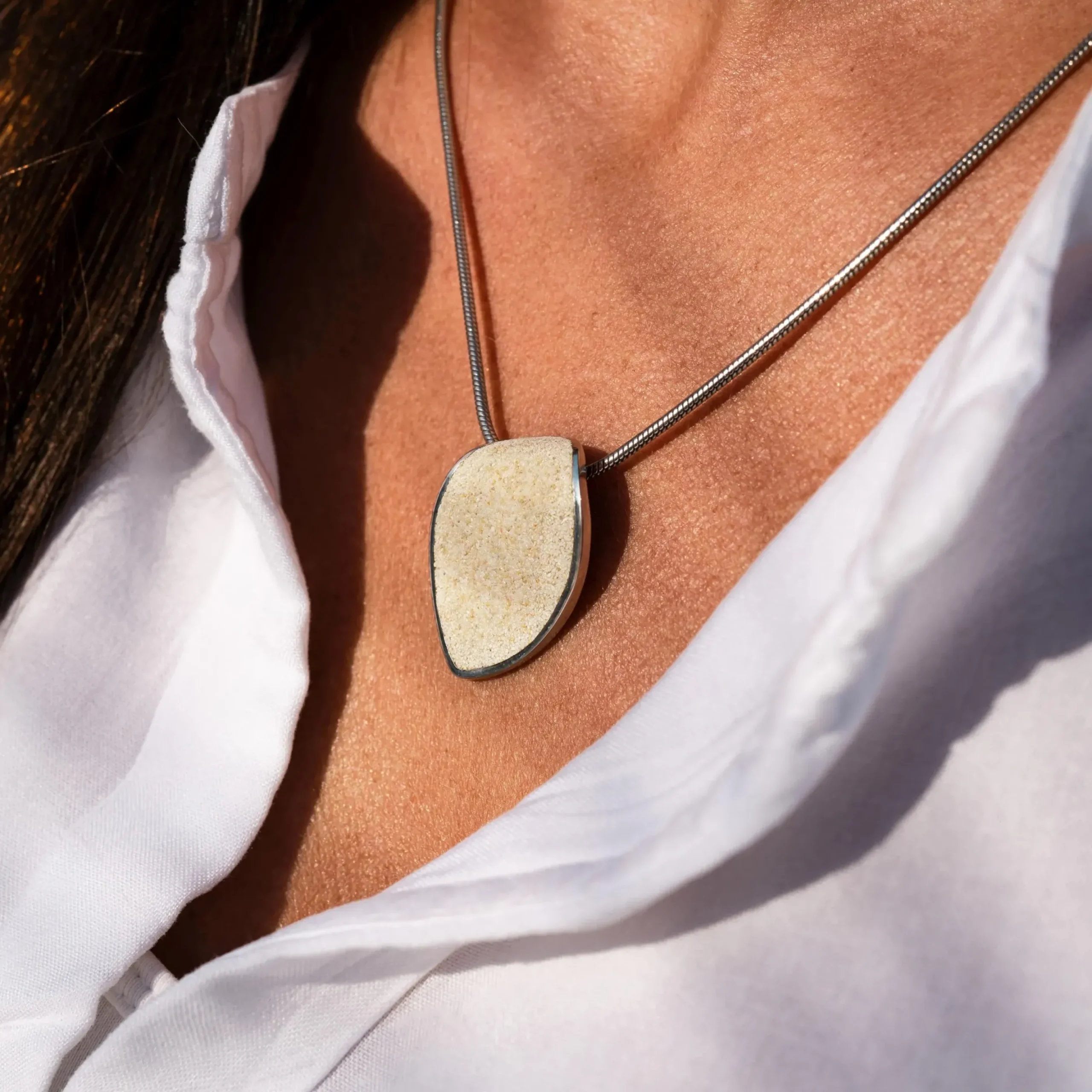 Ovaler, geschwungener Anhänger „Sandinsel“, gefüllt mit Strandsand und auf der Rückseite angebrachter Öse, gefasst in rhodiniertem 925er Sterling-Silber.