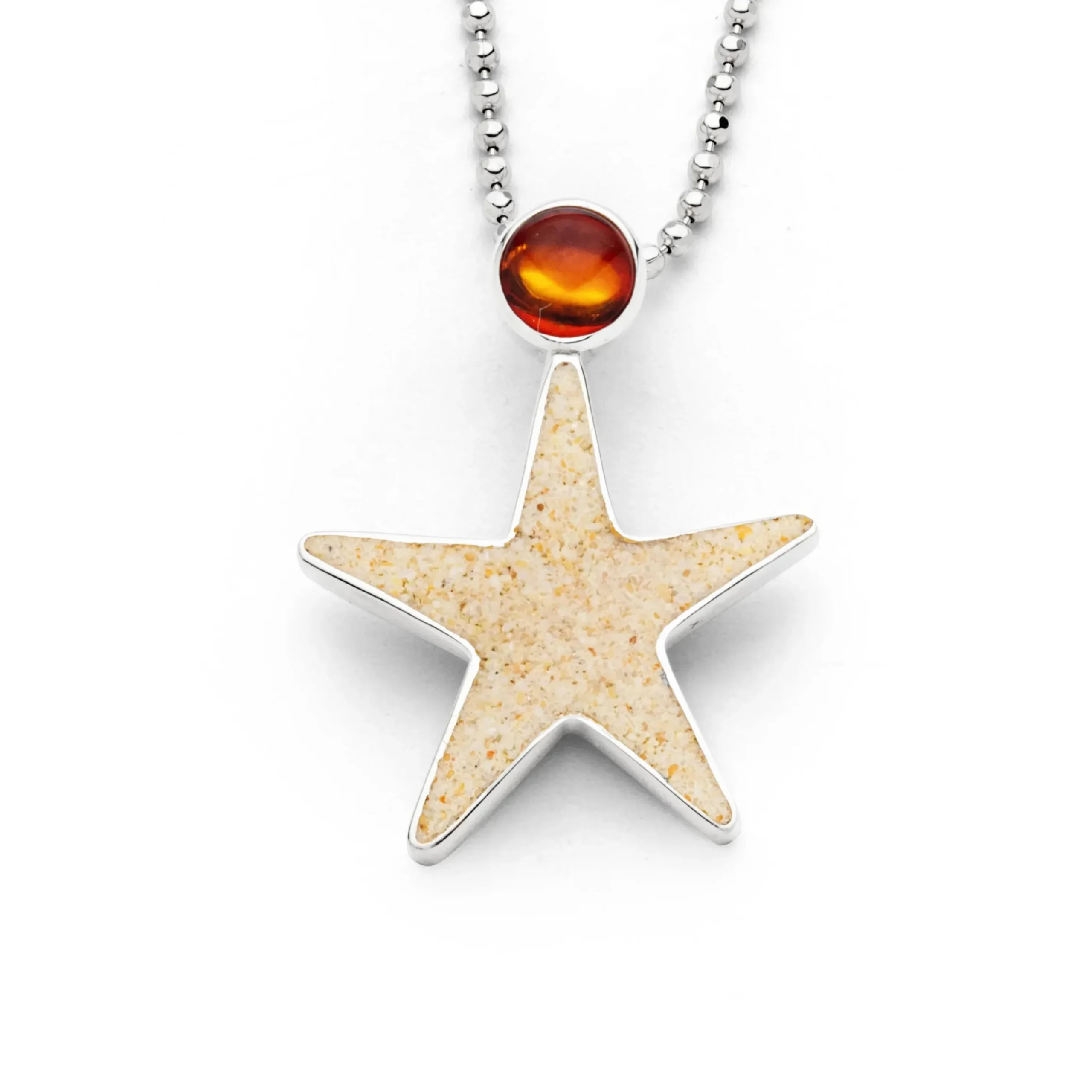 Handgefertigter Anhänger in Form eines Seesterns, gefüllt mit Strandsand, sowie einem Bernstein, alles gefasst in 925er Sterling-Silber
