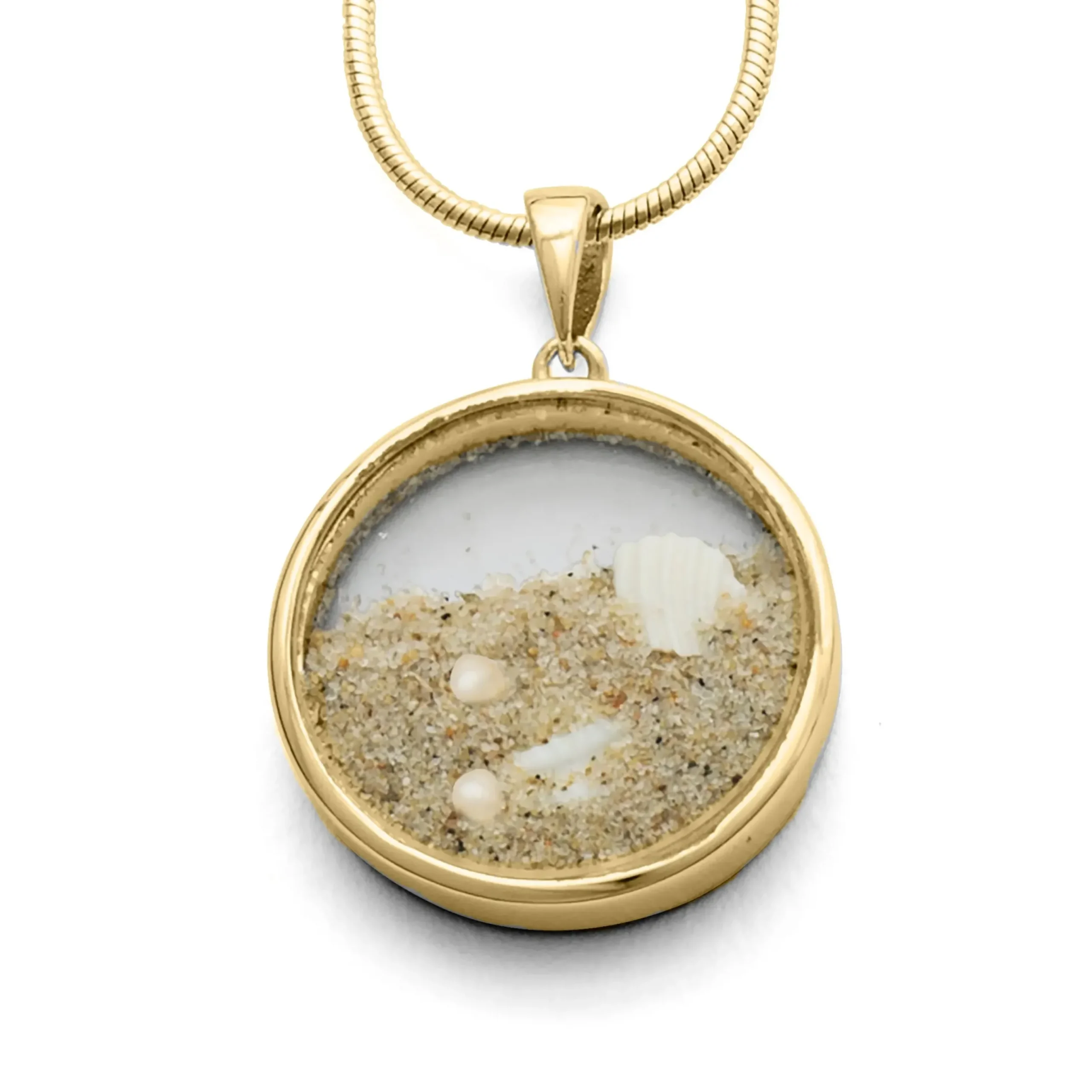Großer runder Anhänger „Sandsturm“, gefüllt mit losem Strandsand, Muschelstückchen und kleinen Süßwasserperlen. Transparent eingearbeitet in Glas und gefasst in vergoldetem 925er Sterling-Silber. Durch die größere Öse gut kombinierbar mit verschiedenen Ketten, zum Beispiel Kugelketten. Dieser Anhänger ist nicht wasserdicht.