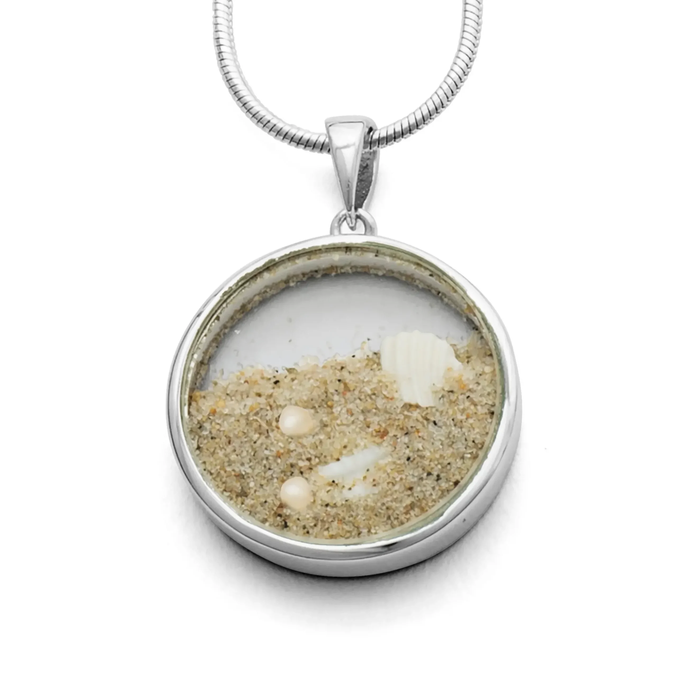 Großer runder Anhänger „Sandsturm“, gefüllt mit losem Strandsand, Muschelstückchen und kleinen Süßwasserperlen. Transparent eingearbeitet in Glas und gefasst in rhodiniertem 925er Sterling-Silber. Durch die größere Öse gut kombinierbar mit verschiedenen Ketten, zum Beispiel Kugelketten. Durch die Rhodinierung ist das Schmuckstück anlaufgeschützt.