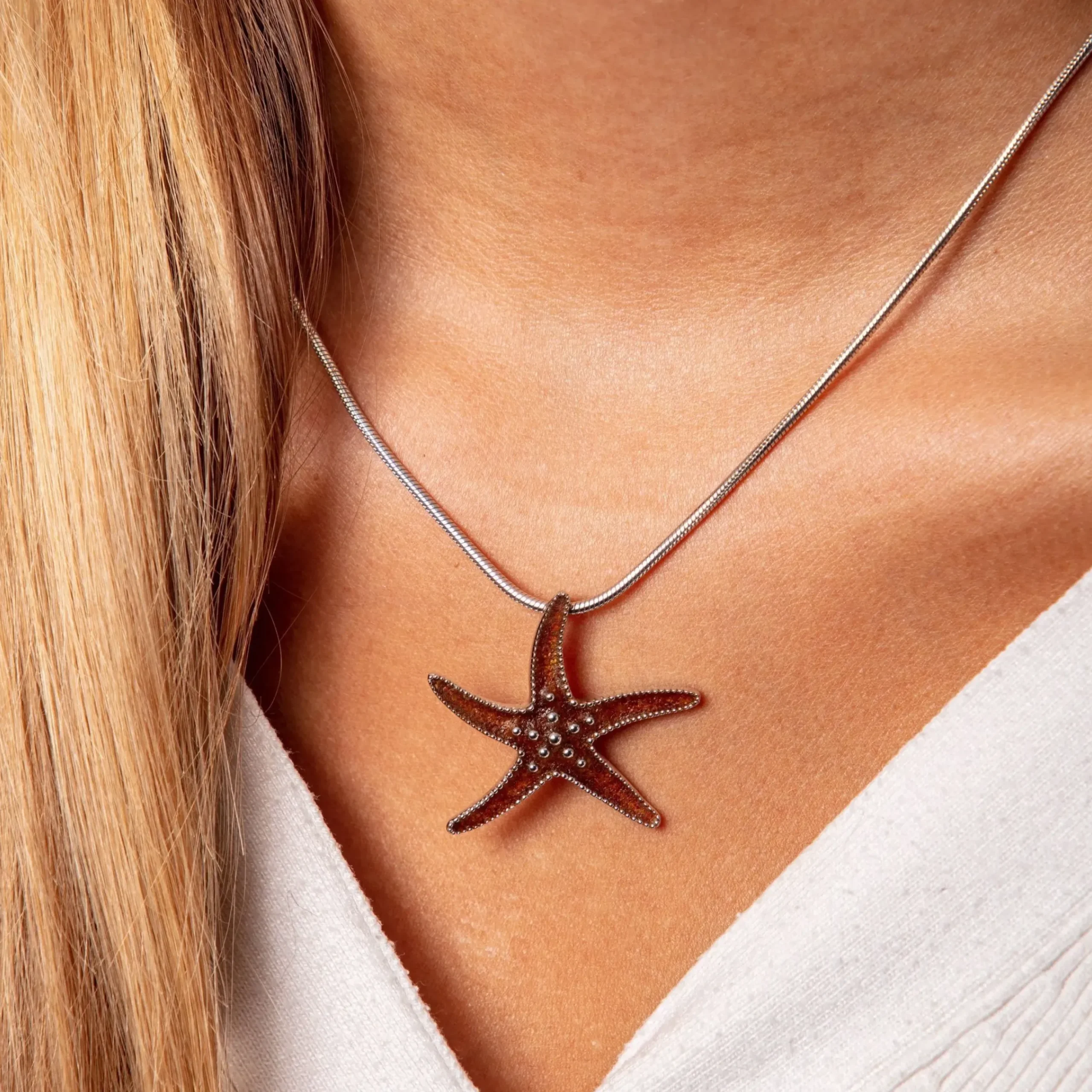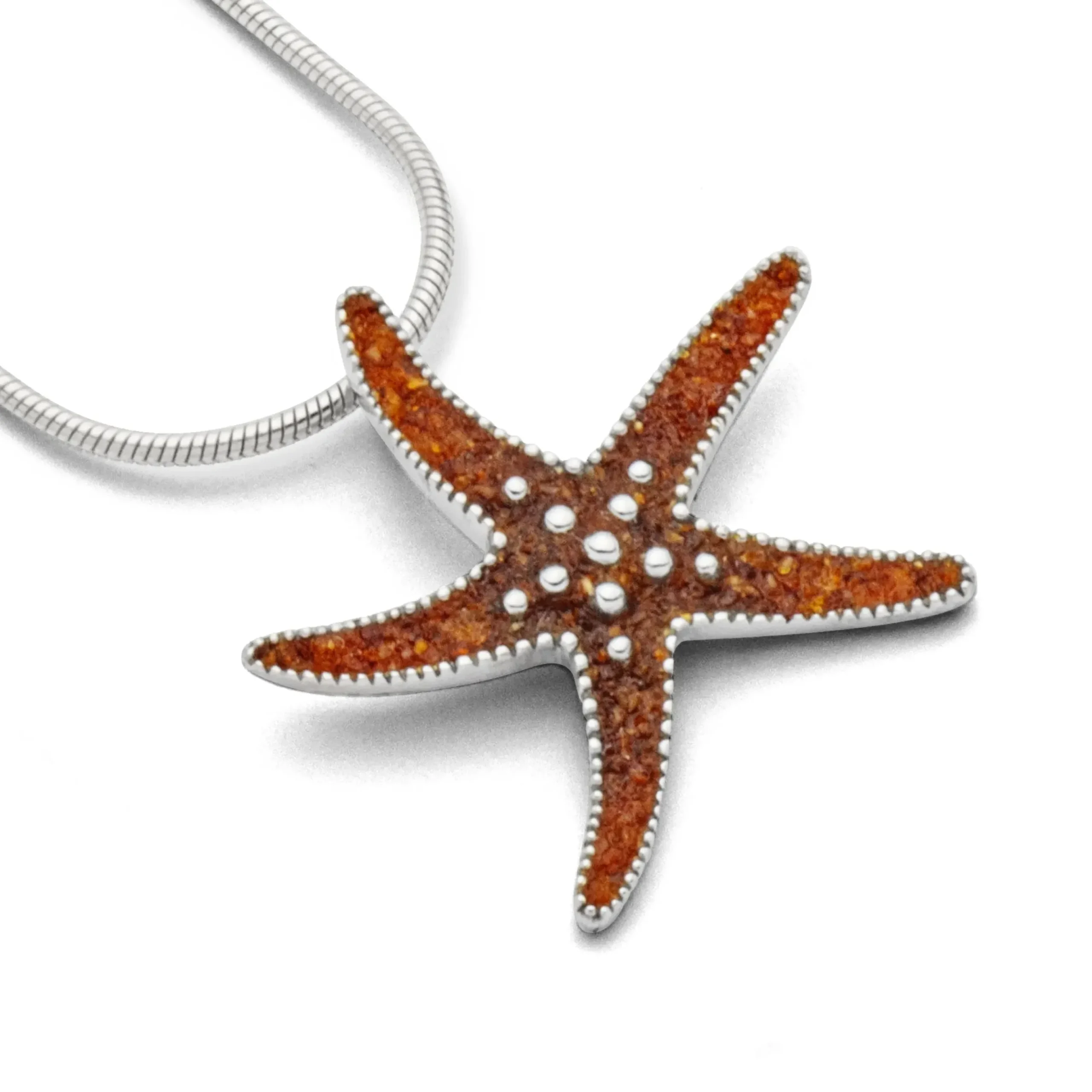 Sonne, Strand und Meer! Dieser außergewöhnliche Seestern-Anhänger weckt Urlaubsgefühle und ist ein absolutes „Must-Have“ für alle, die ein maritimes Statement setzen möchten.Der Anhänger in Form eines Seesterns verzaubert mit klarem, glänzendem Design und einer Füllung aus echtem Bernsteinsand. Verziert wird der Anhänger durch kleine Silberkügelchen, die das Schmuckstück zum funkeln bringen.Durch die außergewöhnliche Materialkombination von feinem Bernstein und hochwertigem, rhodiniertem 925er Sterlingsilber (anlaufgeschützt) ist dieser zeitlose Anhänger ein echter Blickfang, der jedem Dekolleté eine umwerfende Ausstrahlung verleiht.