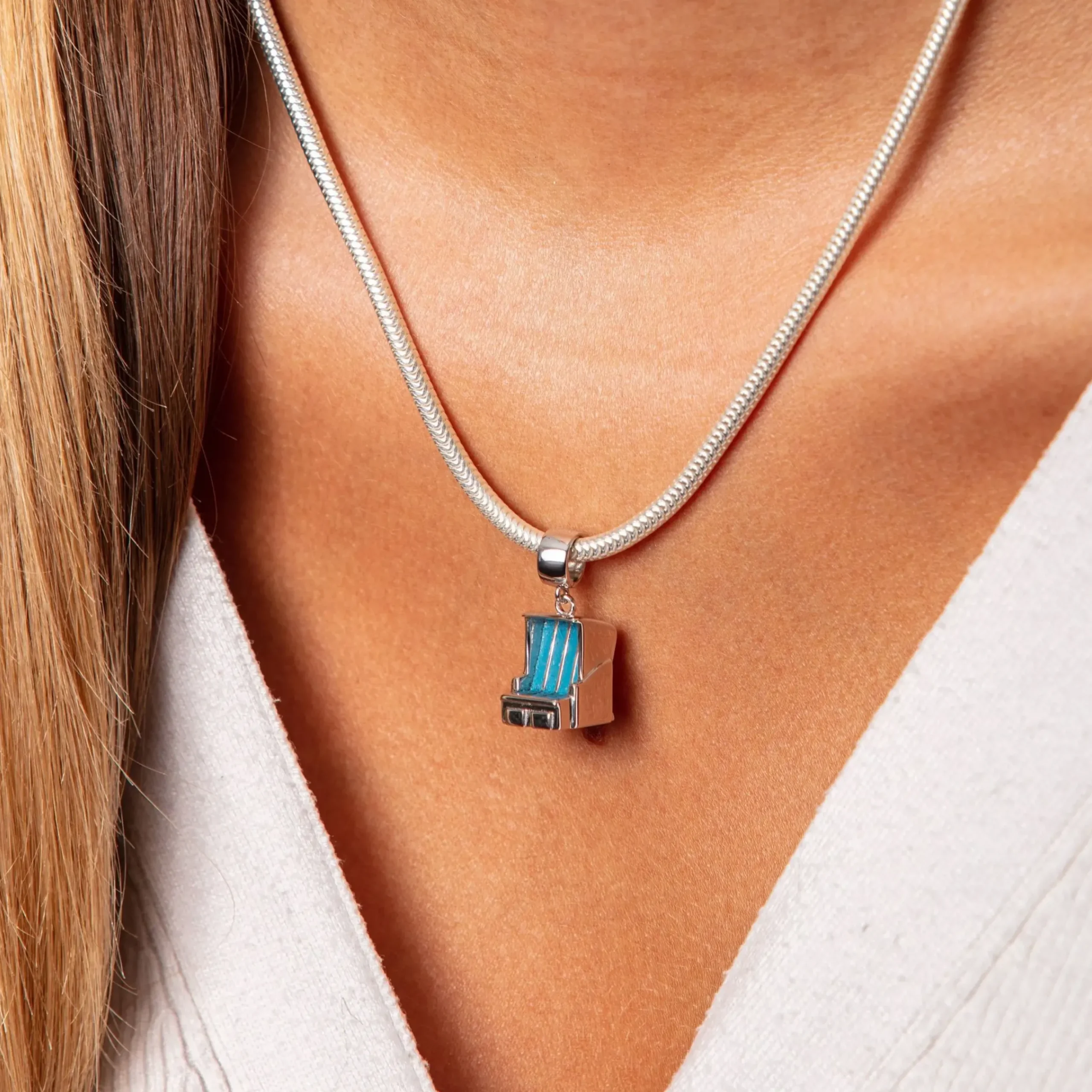 Echte Sehnsucht: Anhänger „Strandkorb“ gefüllt mit Steinsand blau, einer schönen stabilen runden Öse. Dieser Anhänger ist sowohl an einer Kette als auch an einem Sammelarmband zu tragen. Alles gefasst in poliertem, rhodiniertem 925er Sterling-Silber.