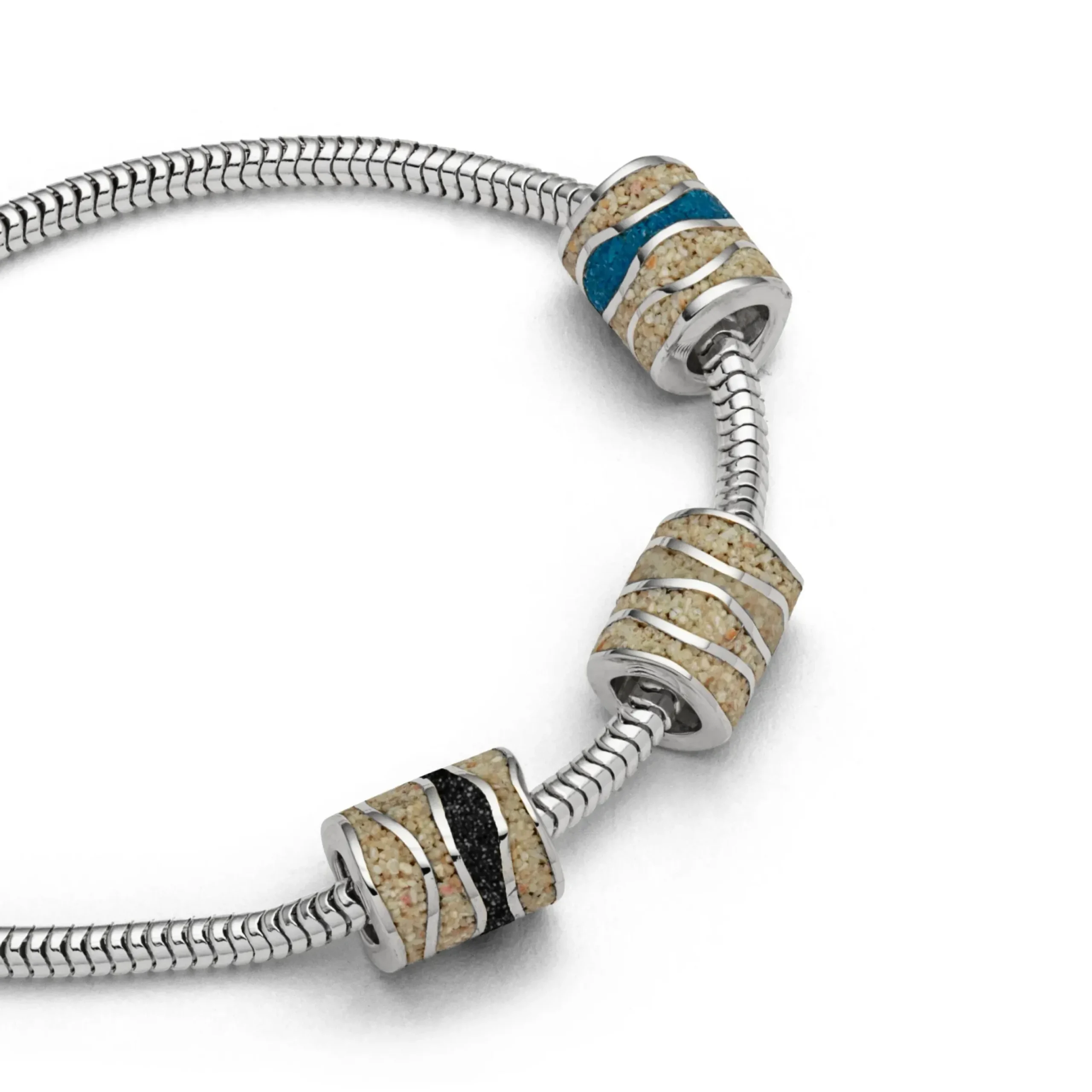 Anhänger „Strandwellen“ Tönnchen-Anhänger mit Wellenmuster, gefüllt mit Strandsand und Lavasand, aus rhodiniertem 925er Sterlingsilber.