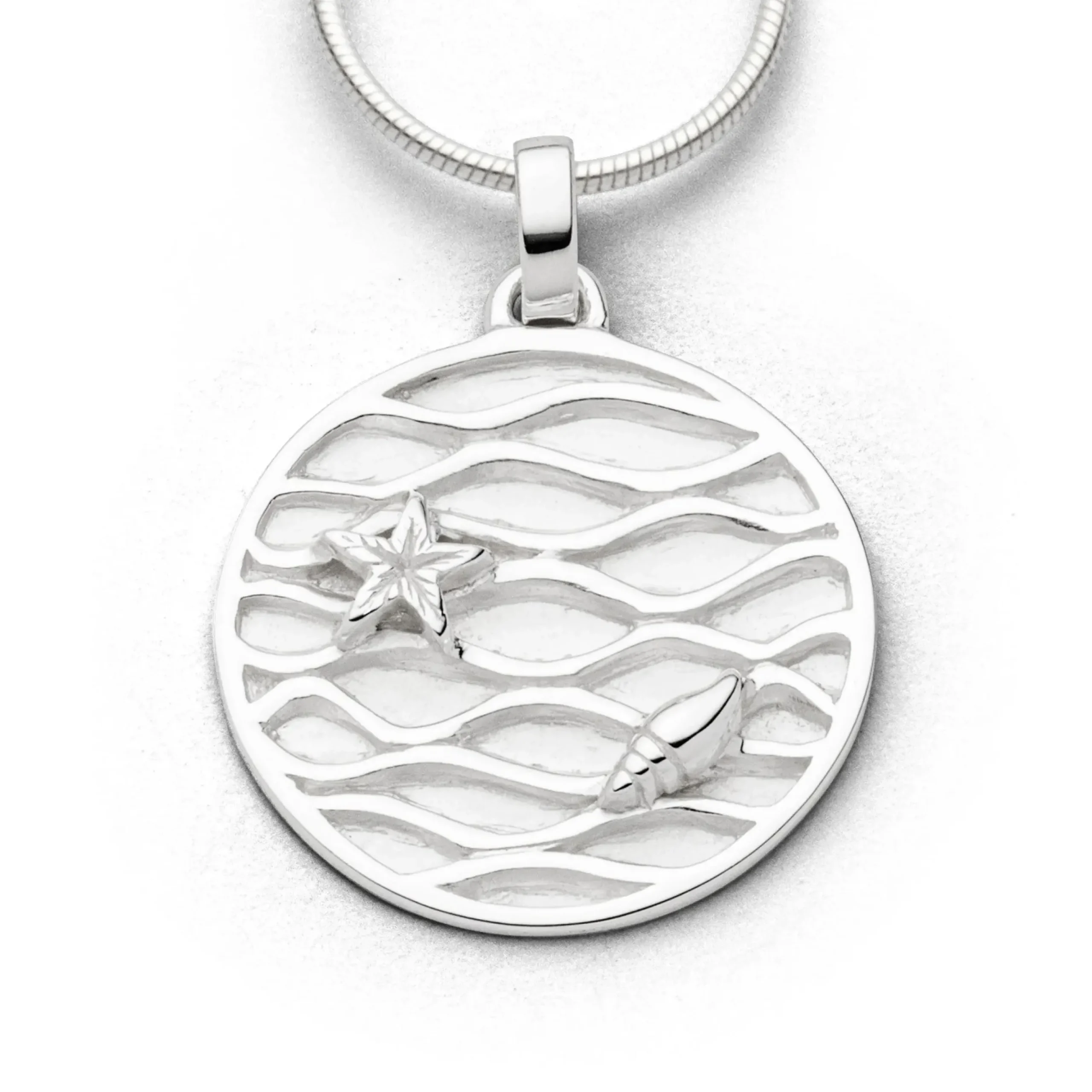 Runder Anhänger „Strandwellen 2.0“ mit einer Muschel und einem Seestern auf einem Wattenmeer-Muster aus mattiertem und poliertem 925er Sterling-Silber