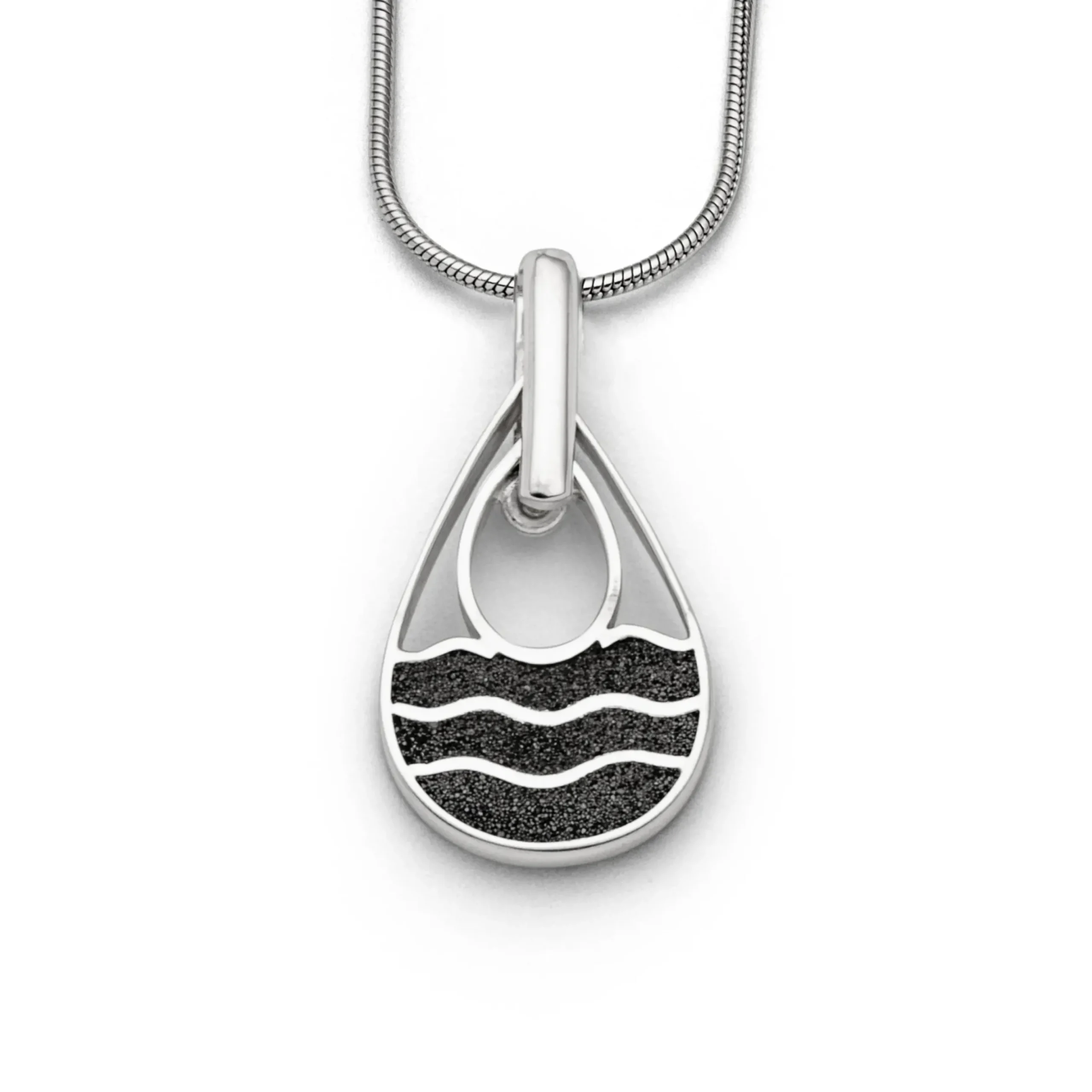 Tropfenförmiger Anhänger „Strandwellen“ klein, in der unteren Hälfte mit einem in Lavasand eingelegten Wellenmuster und alles gefertigt aus rhodiniertem 925er Sterlingsilber. Die große, längliche Öse ermöglicht die Kombination mit verschiedenen Ketten. Durch die Rhodinierung ist das Schmuckstück anlaufgeschützt.