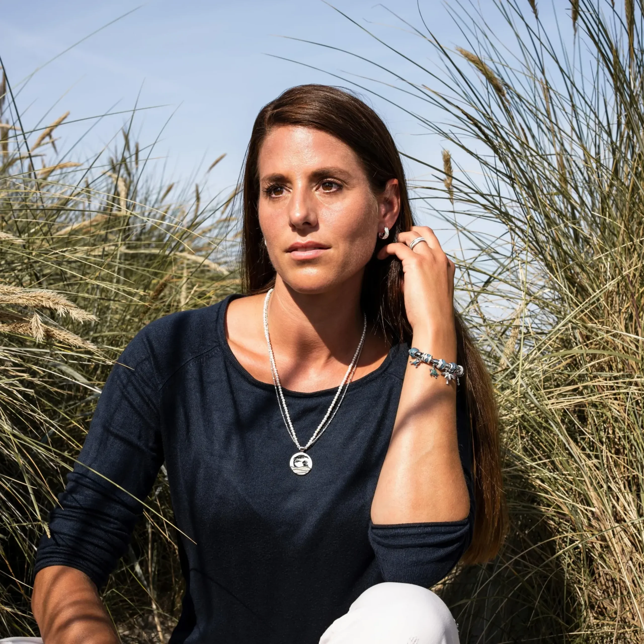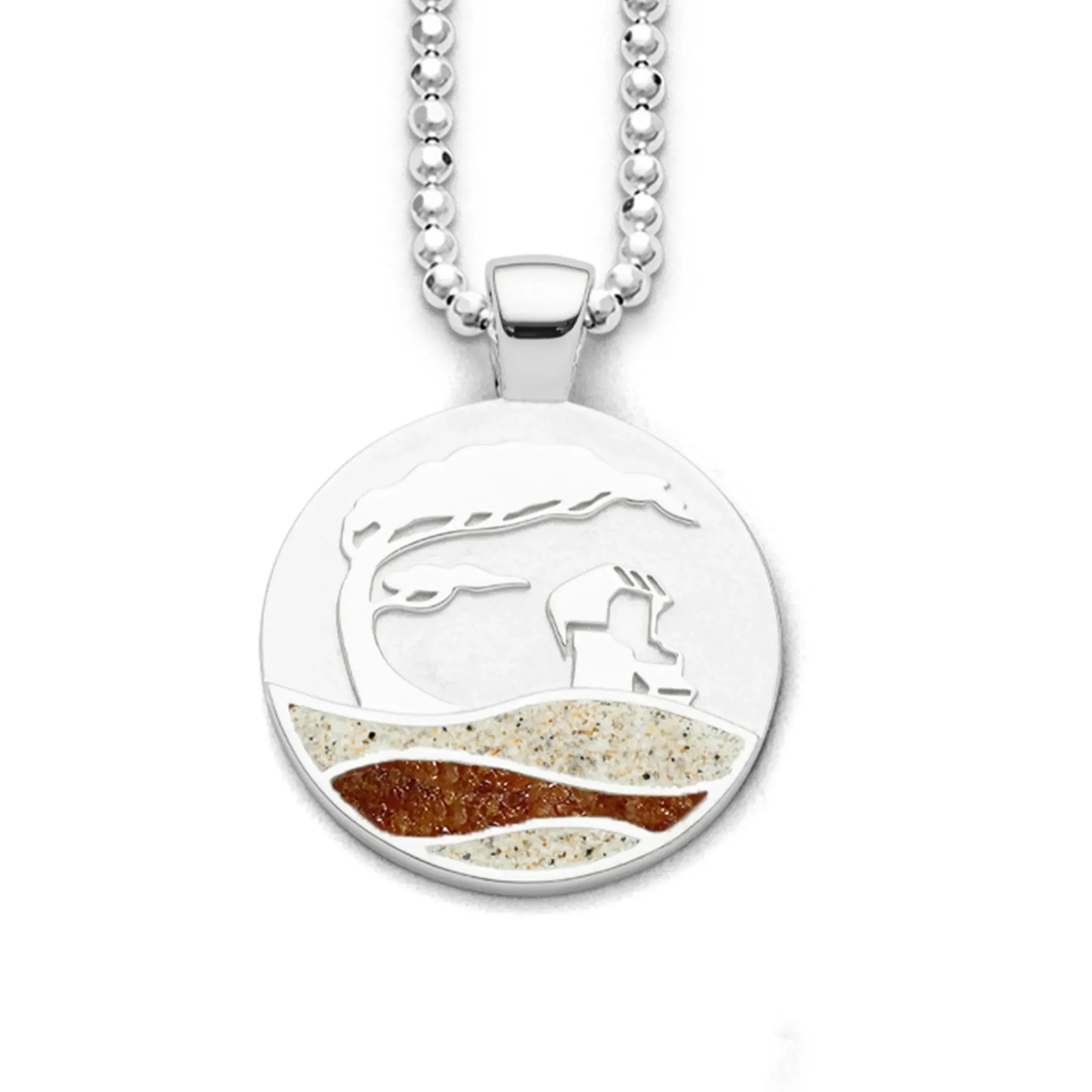 Runder Anhänger Strandwellen „Küste“ mit dem Motiv: Windflüchter und Strandkorb, die Wellen sind abwechselnd eingebettet in Strandsand und Bernsteinsand, alles gefasst in poliertem, rhodiniertem 925er Sterling-Silber.