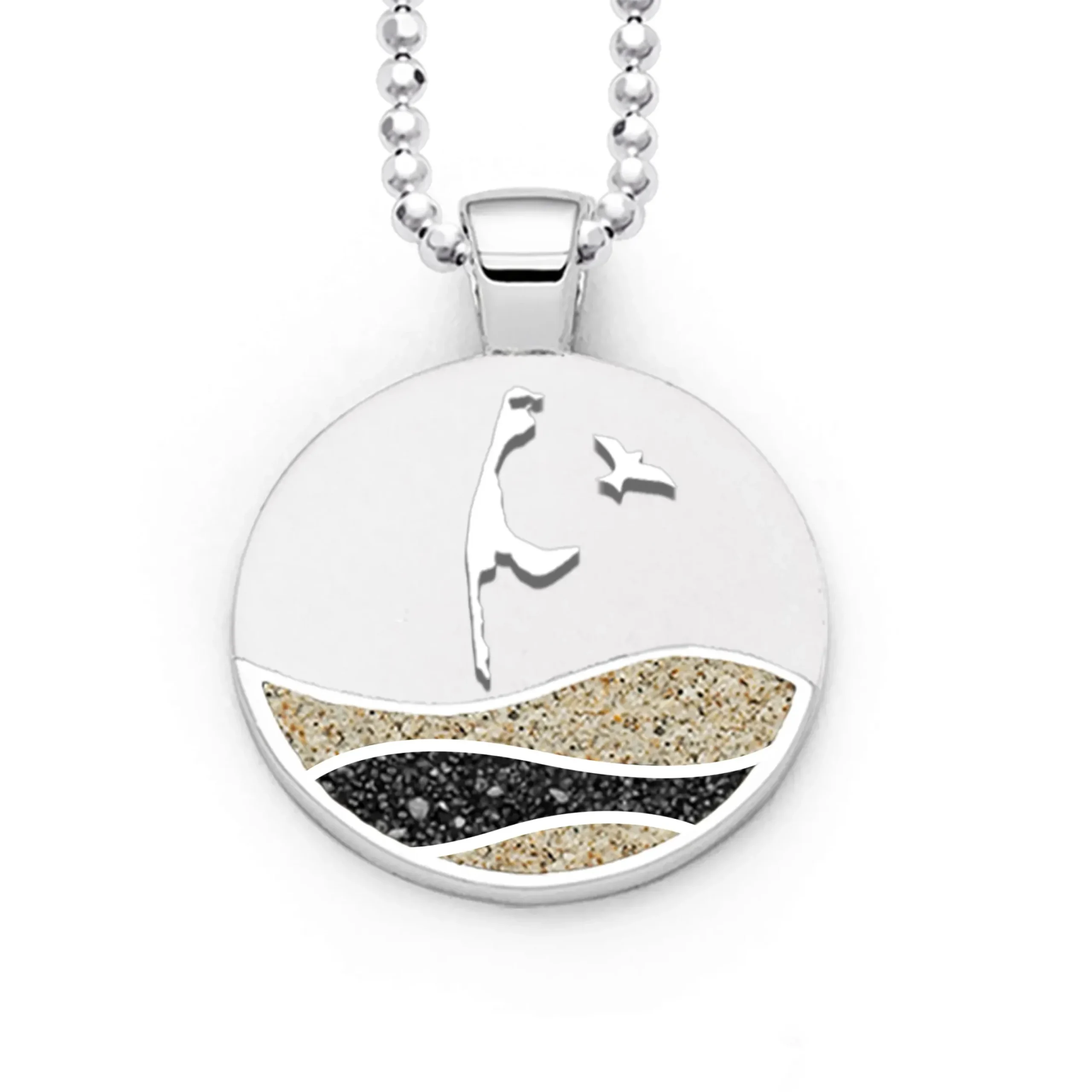Runder Anhänger Strandwellen „Sylt“ mit dem Motiv: Inselsilhouette und Möwe, die Wellen sind abwechselnd eingebettet in Strandsand und Lavasand, alles gefasst in poliertem, rhodiniertem 925er Sterling-Silber.