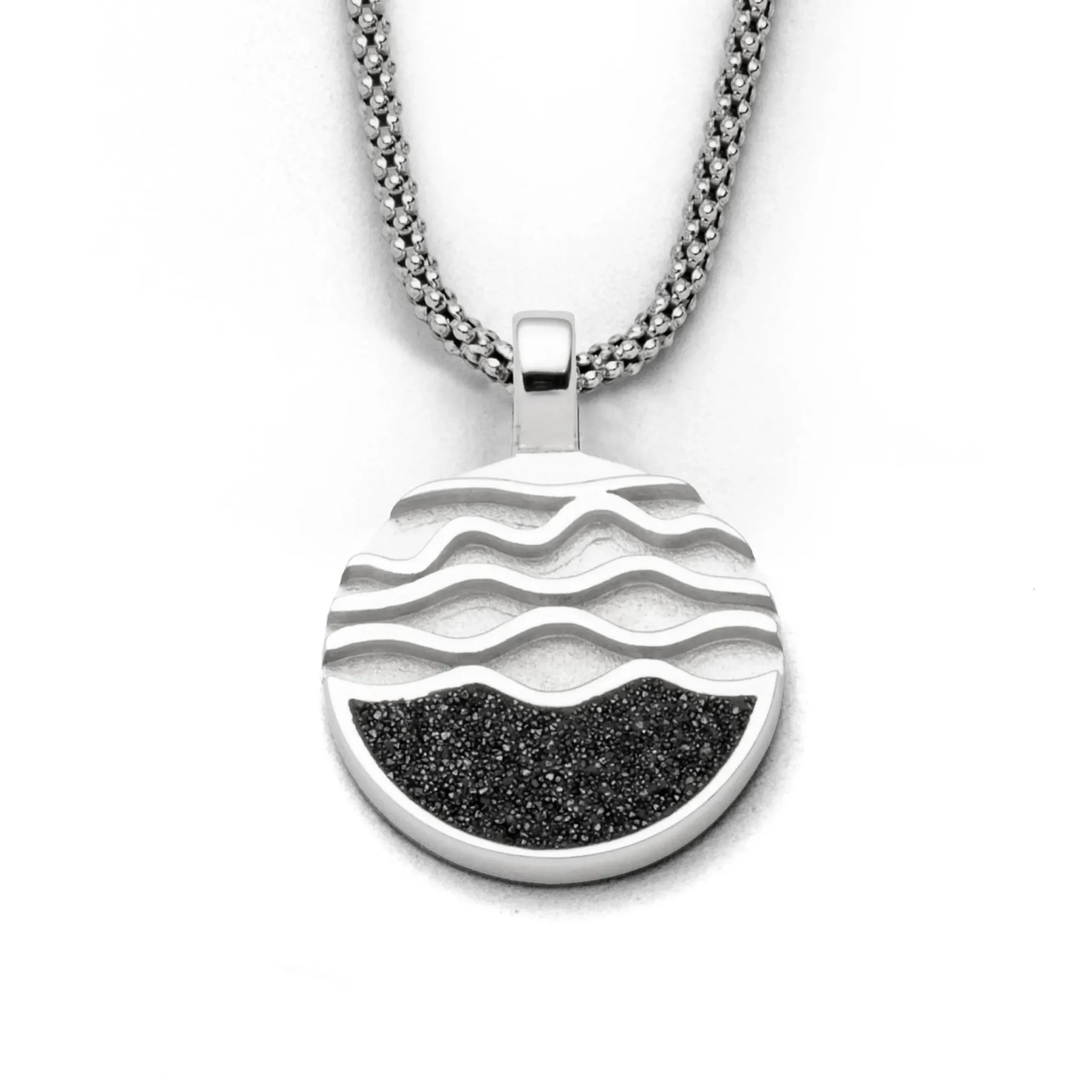 Kleiner, runder Anhänger „Strandwellen“, im unteren Drittel mit Lavasand gefüllt. Durch die große Öse ist eine Kombination mit verschiedenen Ketten möglich. Gefertigt aus rhodiniertem 925er Sterlingsilber. Durch die Rhodinierung ist das Schmuckstück anlaufgeschützt.