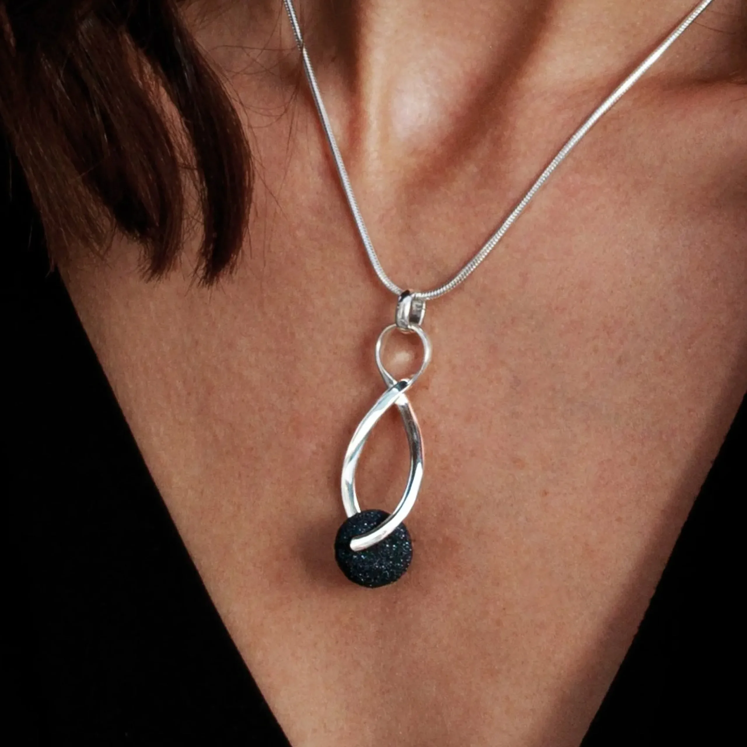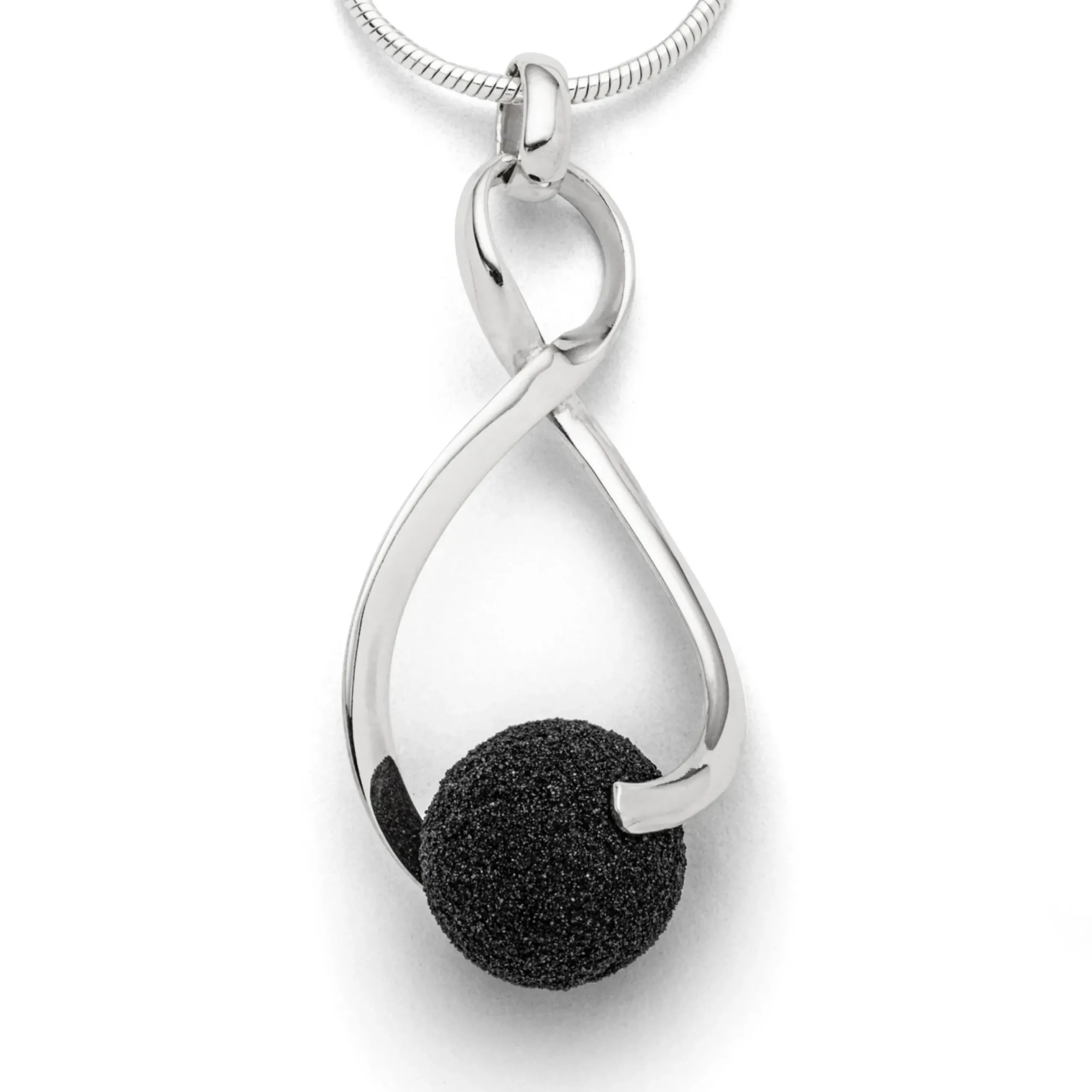 Anhänger „Swinging“ mit einer beweglichen Lavasandkugel an einem gedrehten Silberelement aus 925er Sterling-Silber.