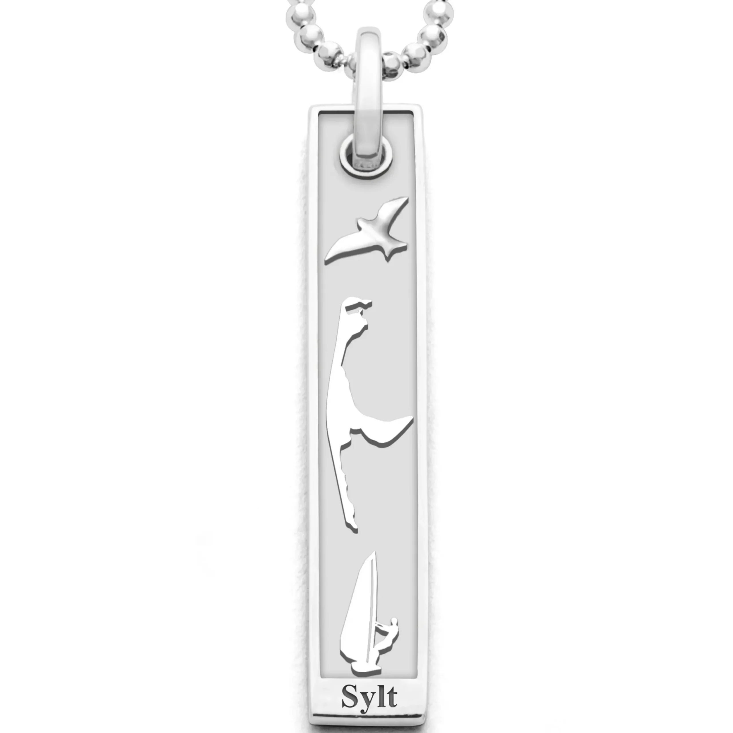 Länglicher Anhänger „Sylt“ mit den Motiven: Möwe, Sylt Silhouette, Surfer, innen mattiert, alles aus rhodiniertem 925er Sterling-Silber.