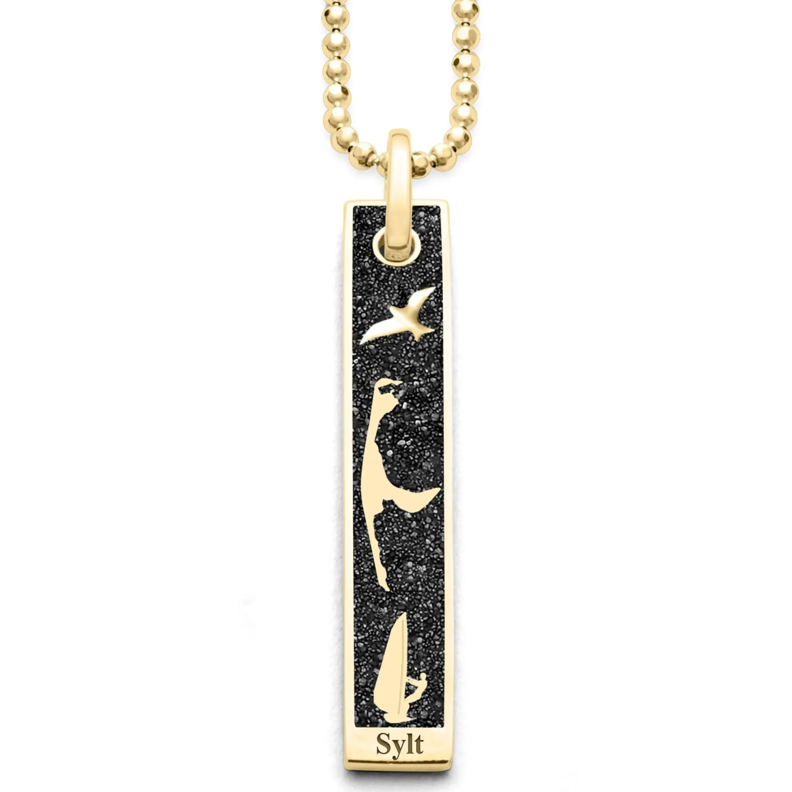 Wellen, Watt, und Wind – die Nordseeinsel Sylt fasziniert mit kilometerlangen Stränden und außergewöhnlichen Naturschauspielen. Als Erinnerung an schöne Urlaubsmomente, aber auch für alle die Meer und Strand lieben, oder ein maritimes Statement setzen möchten, ist dieser stilvolle Anhänger ein unverzichtbarer Begleiter.Der längliche Anhänger verspricht höchsten Tragekomfort durch hochwertige Materialien und überzeugt durch sein klares Design, sowie eine hohe Symbolik, die ihn für jeden Tragenden einzigartig macht.Als Hommage an die Nordseeinsel Sylt vereint der außergewöhnliche Anhänger formschön feinsten Strandsand mit verschiedenen, silbervergoldeten Motiven (Möwe, Sylt Silhouette, Surfer), welche die Vielfältigkeit der Insel auf zauberhafte Weise einfangen.Der geschmackvolle Kontrast zwischen poliertem, vergoldetem Silber, sowie den feinen Sandkörnen zieht alle Blicke auf sich und erinnert an Urlaub am Meer.Funkeln Sie mit diesem entzückenden Schmuckstück um die Wette und tragen Sie immer einen Teil Ihrer Lieblingsinsel ganz nah bei sich.
