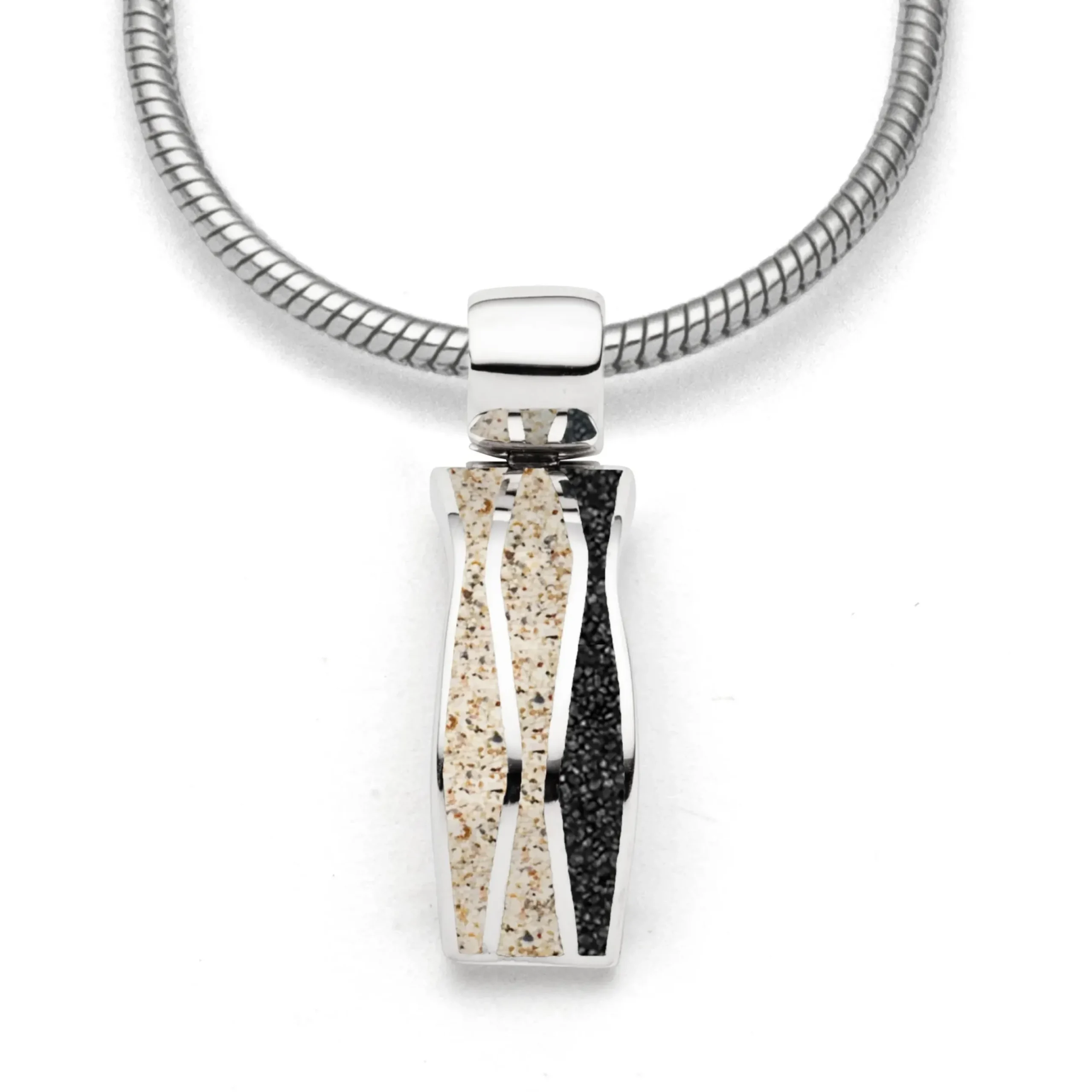 Anhänger „Welle 2.0“, länglicher Anhänger mit silbernen Wellen, im gefüllt mit Strandsand und Lavasand, aus poliertem und rhodiniertem 925er Sterling-Silber