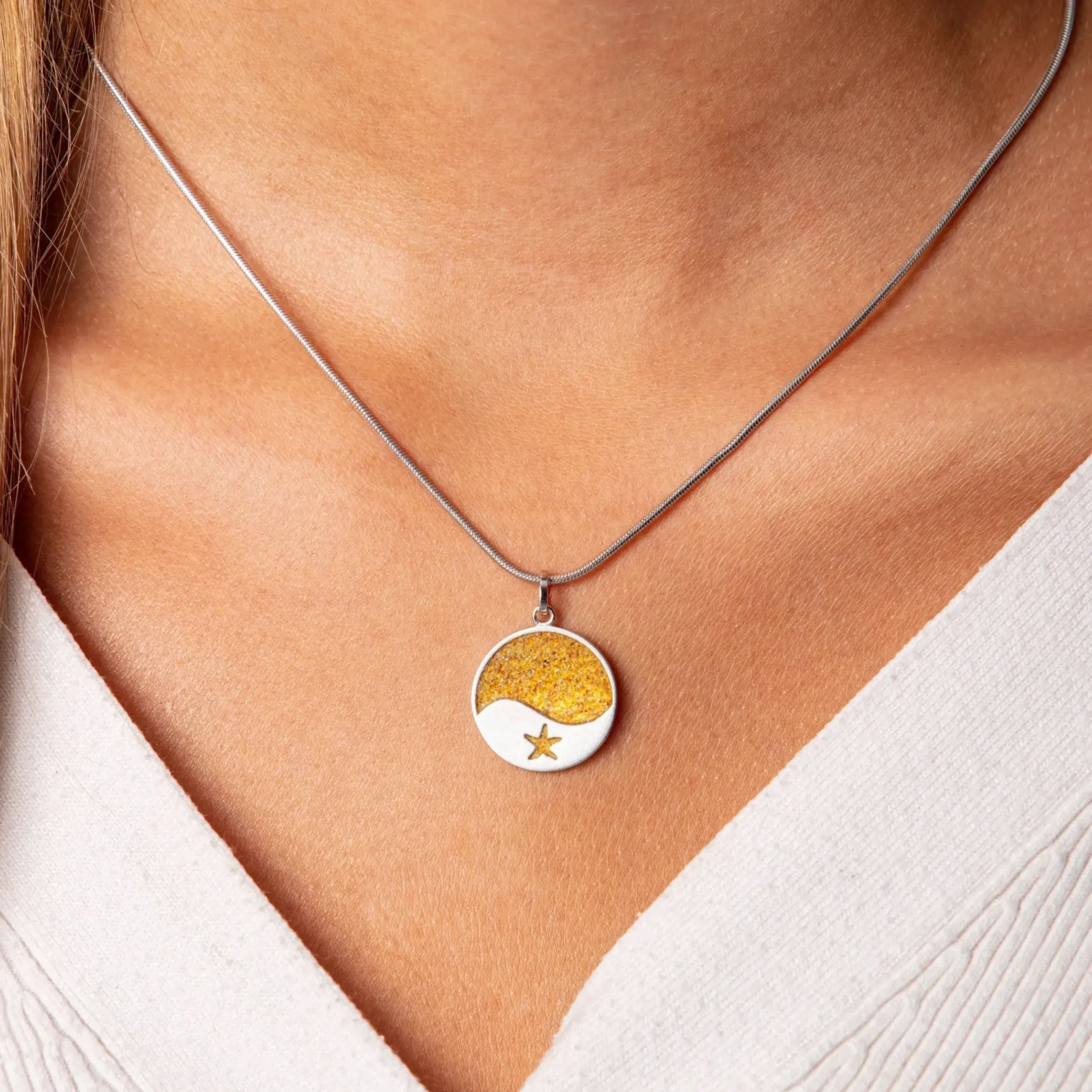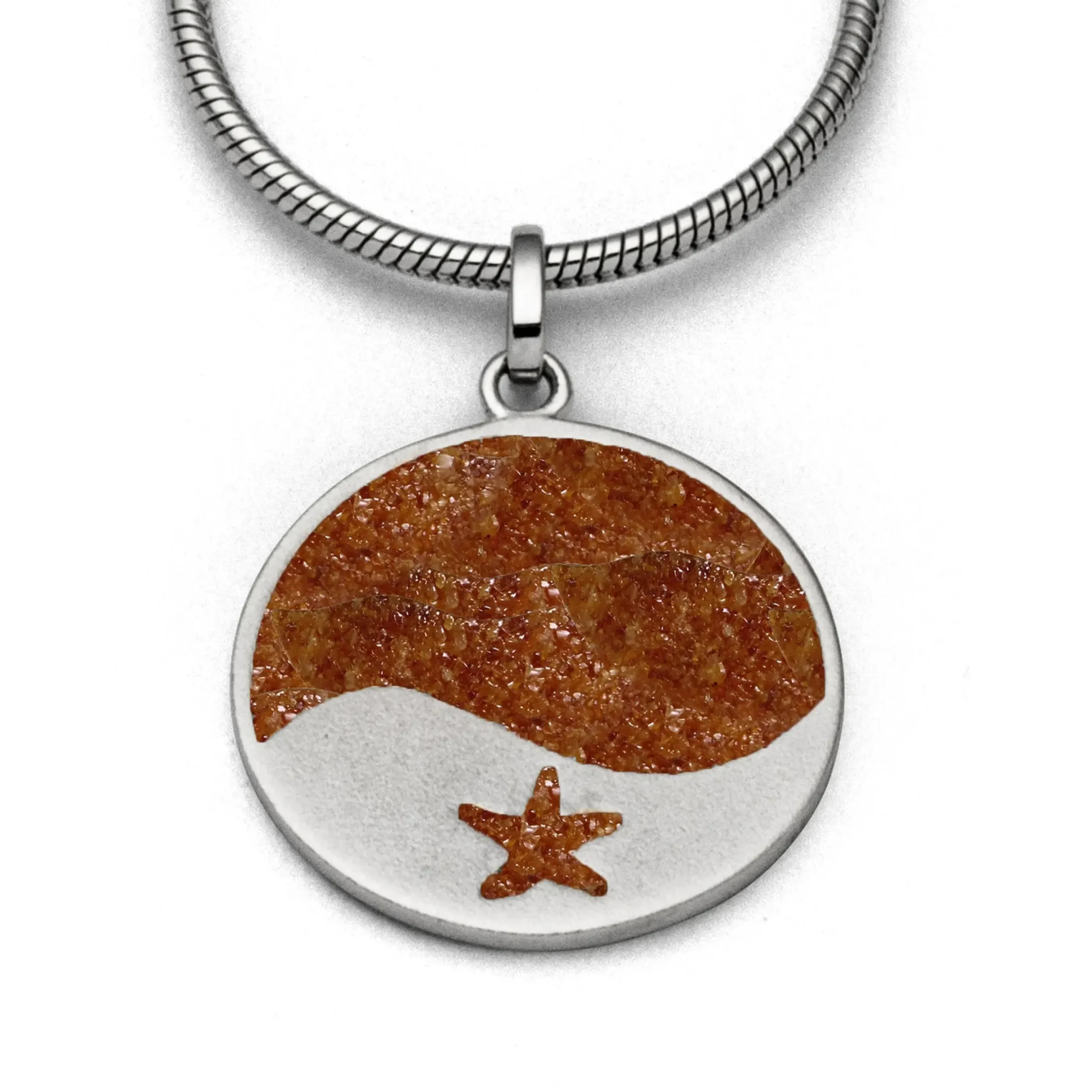 Runder Anhänger mit einer Welle und Seestern (gefüllt mit Bernsteinsand), zur Hälfte eingebettet in Bernsteinsand und gefasst in rhodiniertem, mattiertem 925er Sterling-Silber.