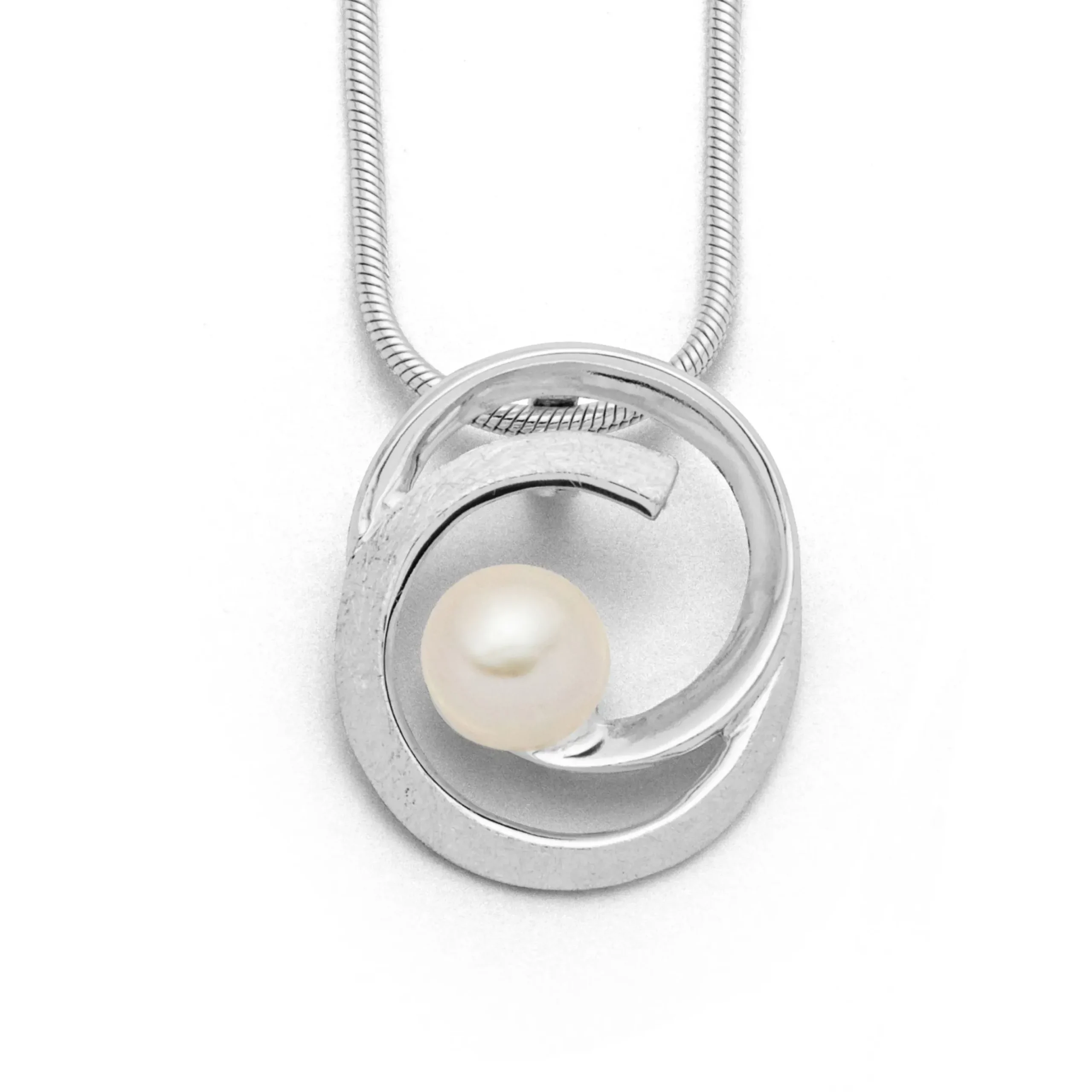 Geschwungener Anhänger „Windbraut“ eine Hälfte poiert und eine gebürstet, mit einer Süßwasser Zuchtperle in der Mitte aus anlaufgeschütztem 925er Sterlingsilber.