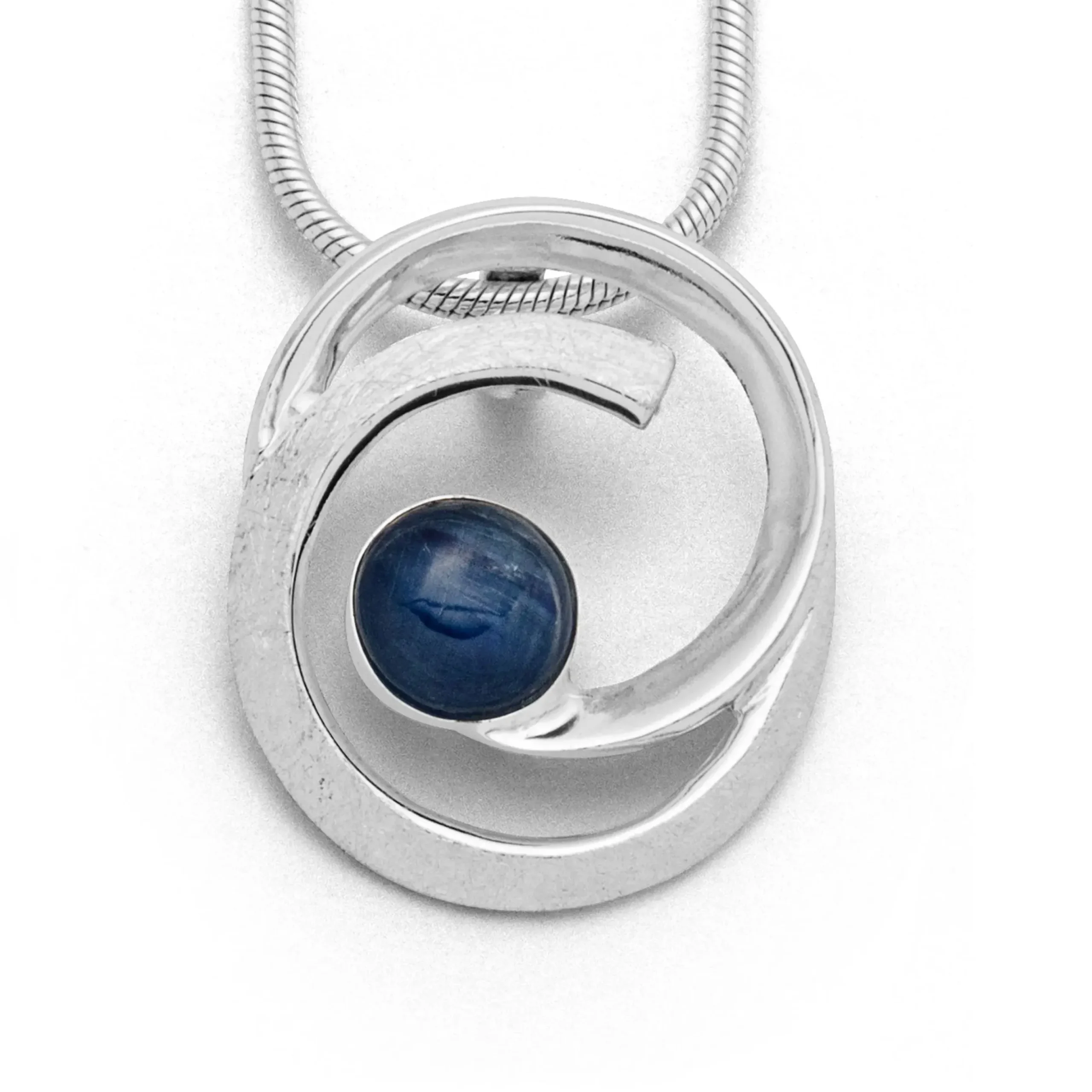 Geschwungener Anhänger „Windbraut“, zu einer Hälfte je glatt und gebürstet, mit einem runden Kyanit , gefasst in anlaufgeschütztem 925er Sterlingsilber.