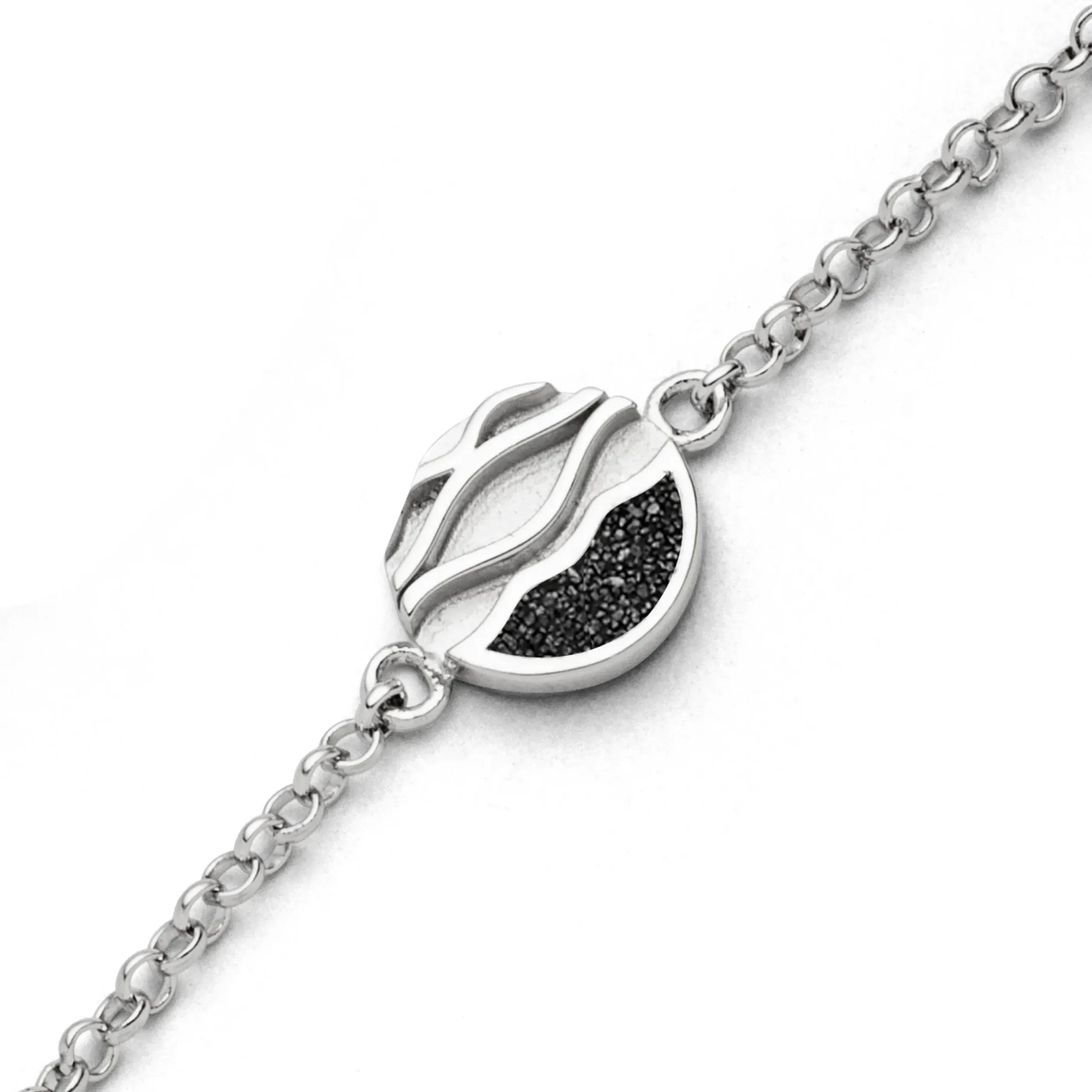 Armband „Strandwellen“ mit einem runden, mit Lavasand gefüllten Element aus rhodiniertem 925er Sterling-Silber, ca.16.5 cm lang plus 3 cm Verlängerung. Durch die Rhodinierung ist das Schmuckstück anlaufgeschützt.